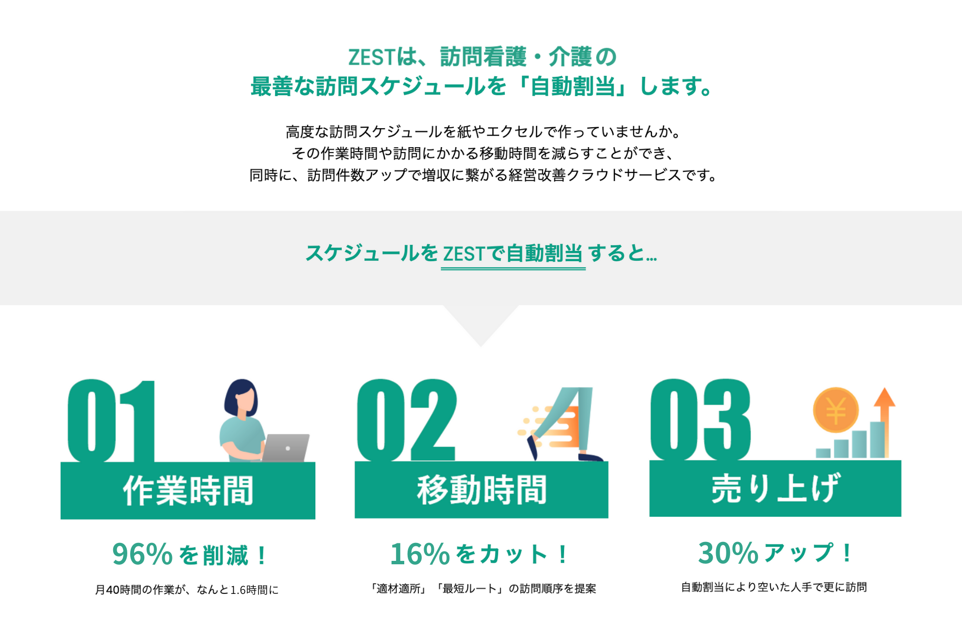 『ZEST』は、今まで紙やエクセルで対応していた在宅医療のスケジュール調整を自動化し、「最短ルート」で「訪問すべきスタッフ」を「訪問すべき時間」に割り当てることで業務効率化を実現するクラウドサービスです。