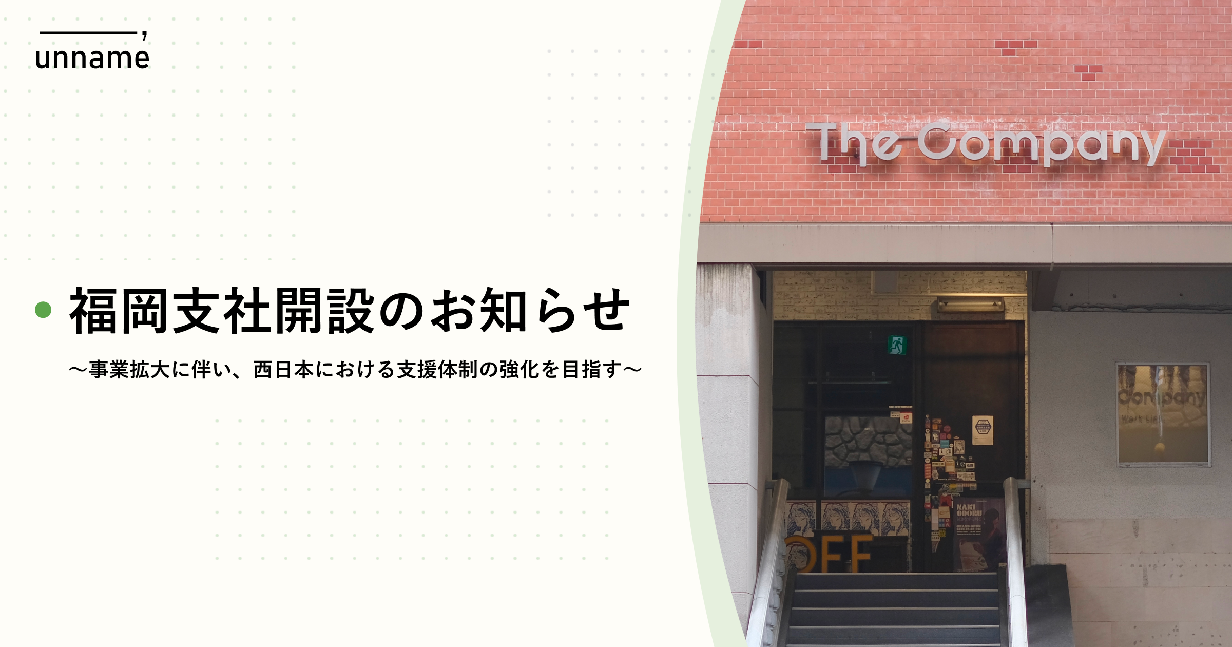 熊本で生まれ育ち、大学時代の4年間を福岡で過ごし、社会人のスタートとともに九州を離れてから8年、子育てというタイミングもありかねてより希望していた福岡へのUターンが叶いました。unnameとして初めて支社を構える福岡は、首都圏、大阪の次にスタートアップの設立数が多い地域であり、東京に本社を構えるスタートアップ企業の多くが支社を展開するエリアでもあります。そして天神ビッグバンを中心とした再開発により、今後のさらなる発展が見込まれる福岡の地で、地元企業をはじめとしたあらゆる企業にマーケティングとコンサルティングの両軸を起点に、持続可能な企業成長を支援したいと考えています。
