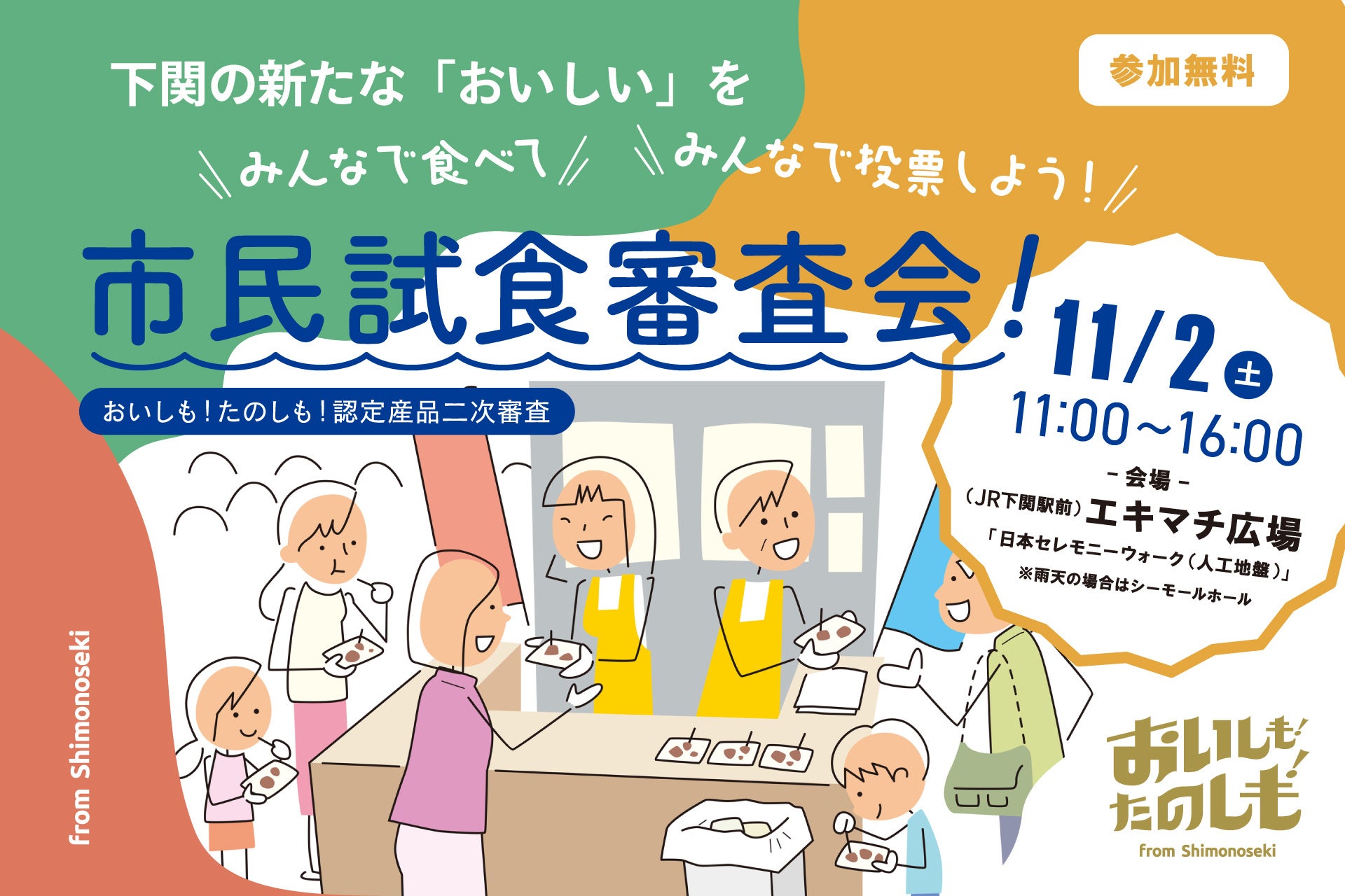 下関市民に愛される産品を、「おいしも!たのしも!」産品に認定したい。そんな想いから、審査委員会による一次審査を通過した認定候補産品を市民の皆さんに実際に試食・評価していただく機会です。審査は、認定候補産品を試食して投票するだけ。ぜひ、「おいしも!たのしも!」産品を応援してください。【参加者には、オリジナルステッカーをプレゼント!】