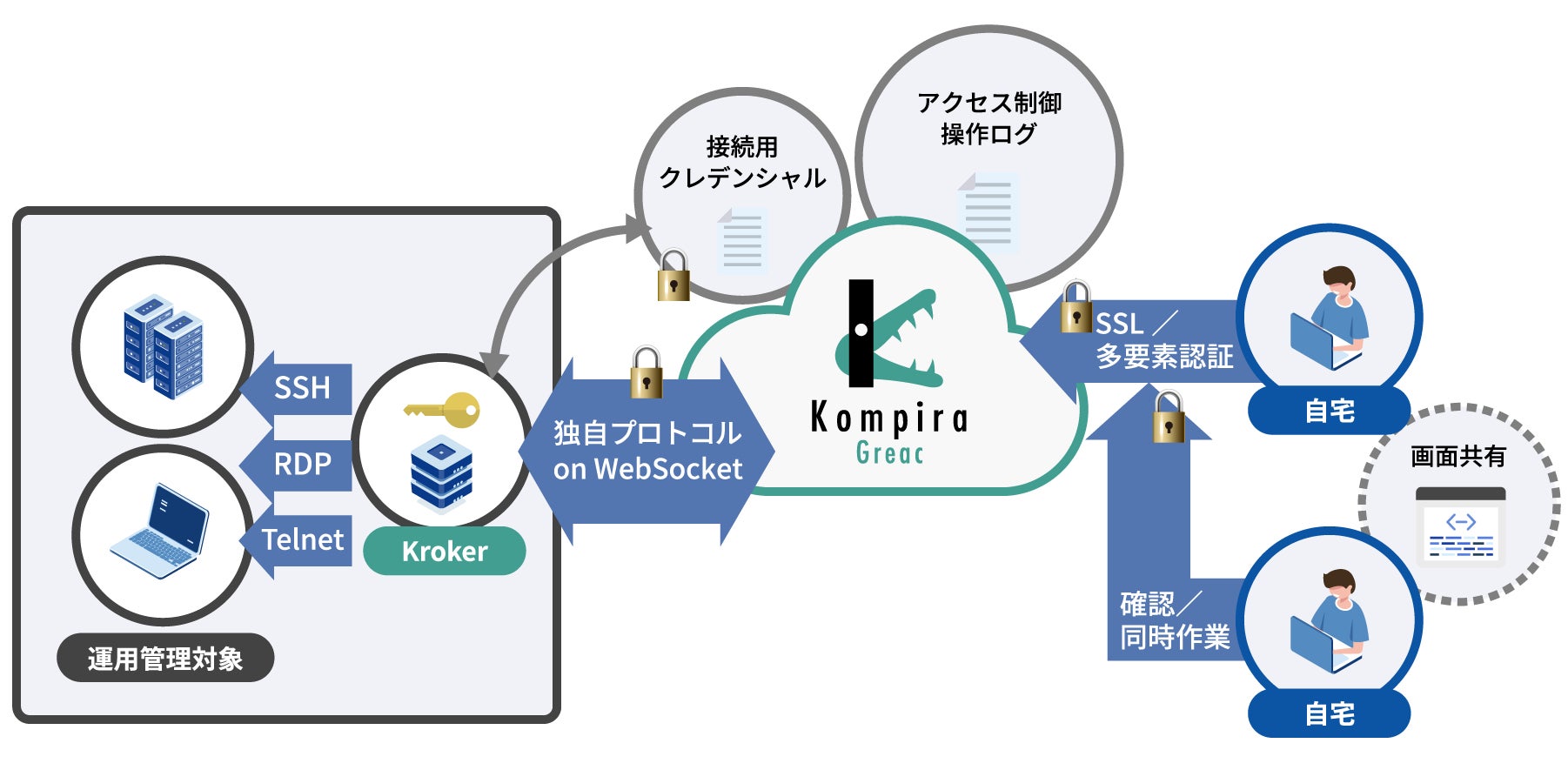 システム運用のリモート作業に必要な「リモートアクセス」「特権ID管理」「証跡管理」の各ソリューションをオールインワンで利用可能にするリモートアクセスサービス「Kompira Greac」を提供開始