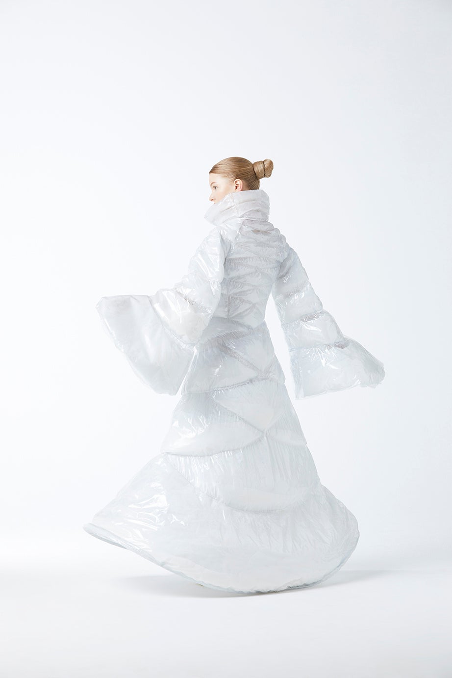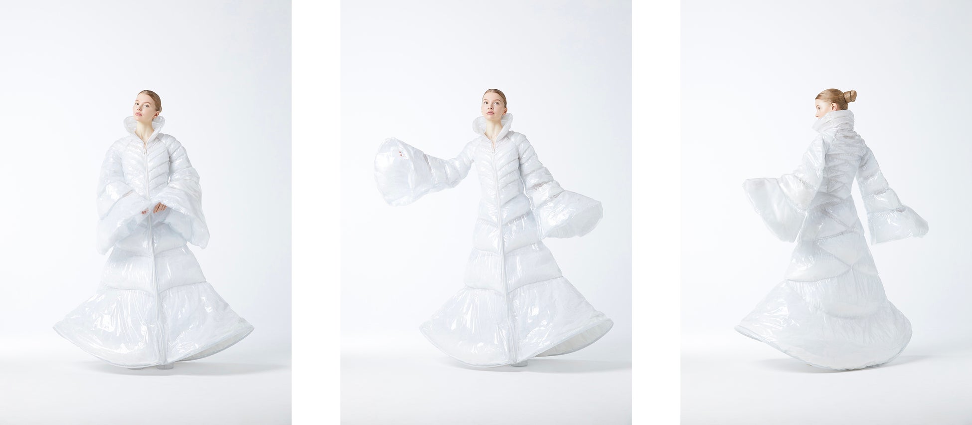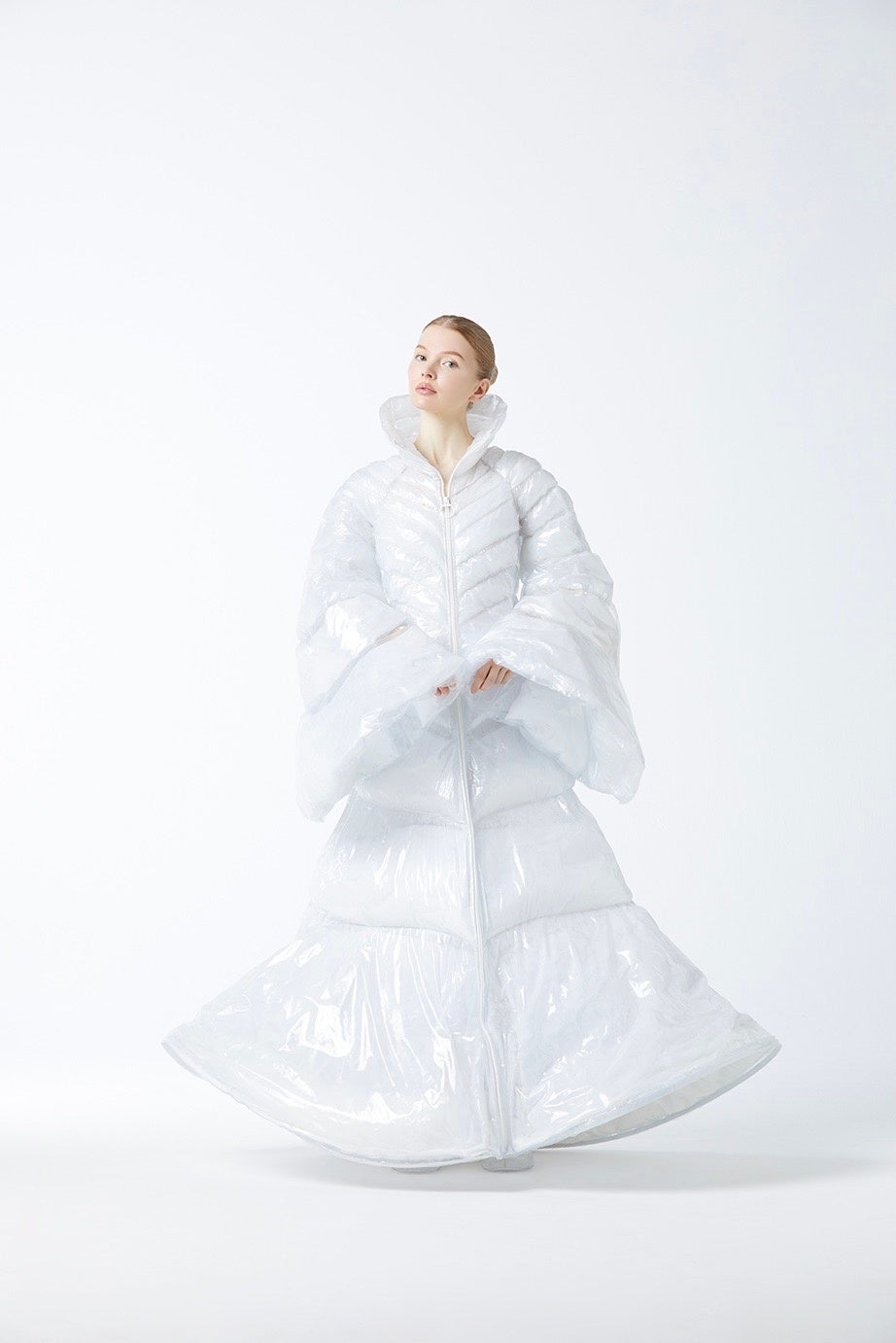 多くの方に注目頂いております、弊社断熱素材「SUFA」とアートのコラボレーションプロジェクト AIR NEW ERAについて、この度第三弾作品となる、弊社エアロゲル「SUFA」を内容物として使ったダウンコートのようなドレス「Vetro Bianco」を、世界限定一点のアートピース作品として販売開始致します。
