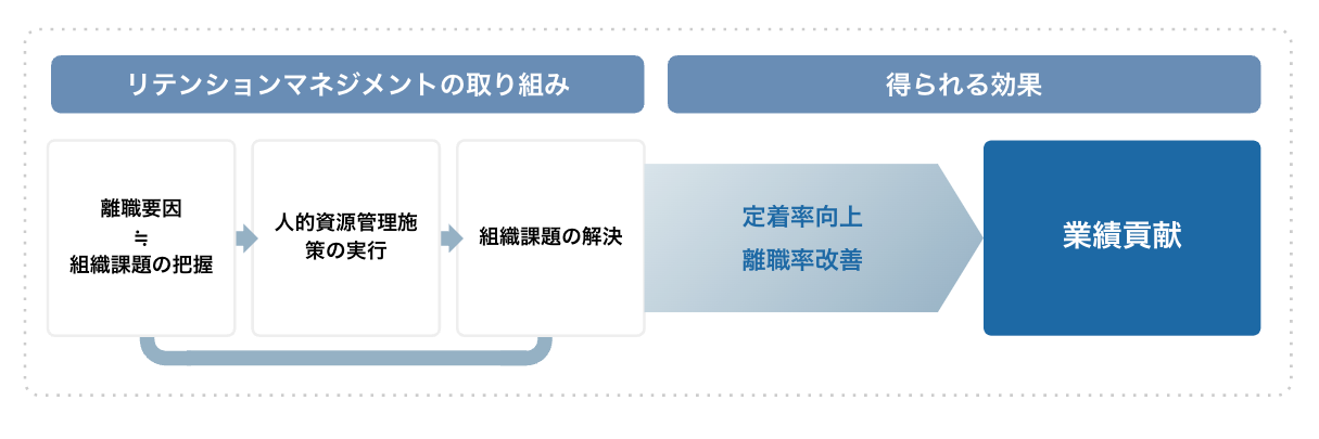 リテンションマネジメントとは、離職要因となり得る組織課題を人的資源管理施策で解決していくアプローチです。適切なリテンションマネジメントは定着率の向上に加え、最終的には人事部からの業績貢献に寄与します。