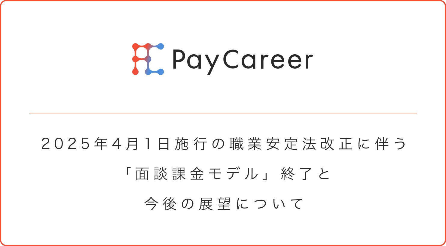 2025年4月1日より施行される職業安定法の改正に伴い、PayCareerが提供してきた「面談課金モデル」を2025年3月31日をもって終了いたします。