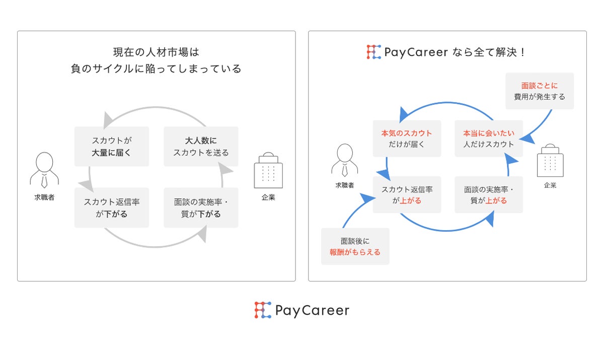 ※「面談課金モデル」とは、PayCareerに登録されている求職者に"報酬"を付帯してスカウトを送り、面談が終了したことを企業が承認することによって、面談に応じた求職者にPayCareerを介して報酬が付与されるしくみのことです。