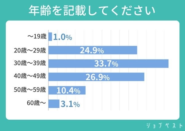 年齢についての質問では、30歳~39歳と回答した方が33.7%と最も多い結果となりました。
