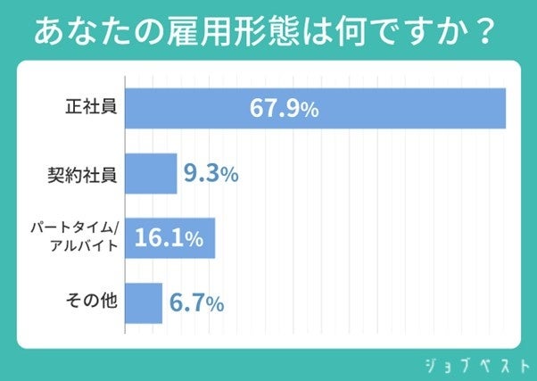 「あなたの雇用形態は何ですか」との質問では、67.9%の方が正社員と回答しました。次にパートタイム・アルバイトと回答した方が16.1%と多い結果となっています。