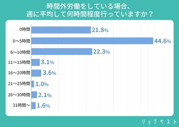 「時間外労働をしている場合、週に平均して何時間程度行っていますか」という質問に対して、「0~5時間」と回答した方は44.6%と最も多い結果となりました。