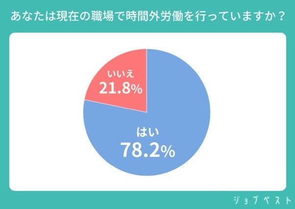 「あなたは現在の職場で時間外労働を行っていますか」との質問では、「はい」と回答した方が78.2%となりました。8割近い方が時間外労働を行っているということが分かります。