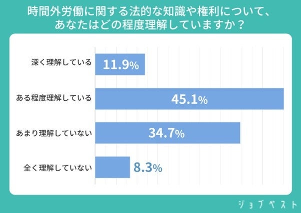 「時間外労働に関する法的な知識や権利について、あなたはどの程度理解していますか」という質問をすると、「ある程度理解している」方は45.1%と最も多く、「深く理解している」方は11.9%となりました。理解している方は全体の57%を占めています。