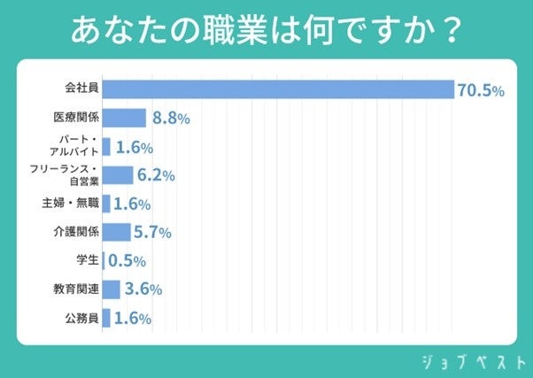 職業について質問すると、70.5%の方が会社員と回答しました。次いで多かったのは8.8%の医療関係の方です。