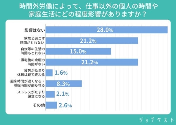 一方で、時間外労働による影響はないという方が28%いました。何も影響を感じていない人もいますが、家族と過ごす時間などプライベートへの影響を実感している人が多くいることが分かります。