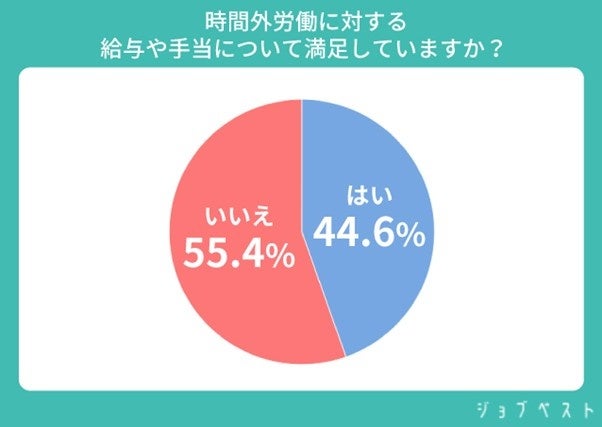 「時間外労働に対する給与や手当について満足していますか」という質問をすると、「はい」と回答した方は44.6%となりました。