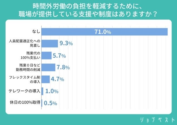 「時間外労働の負担を軽減するために、職場が提供している支援や制度はありますか」との質問に対し、「なし」と回答した方は71%と最も多い結果となりました。