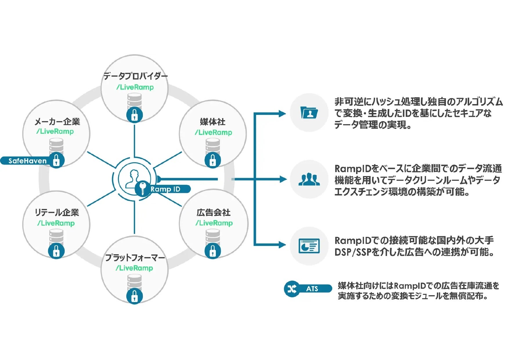 MediaMath、Criteo、The Trade desk、Logicad等RampIDで接続可能な国内外の主要大手DSP事業者とのデータ連携・取引が可能です。媒体社においては、「LiveRamp ATS」を使いログインユーザーID等をRampID化することで、RampIDベースでのターゲティングや、RampIDで取引できるSSPでの在庫販売も行うことができます。DSP・SSP事業者拡大に向けた導入・アライアンスも進めていく予定です。