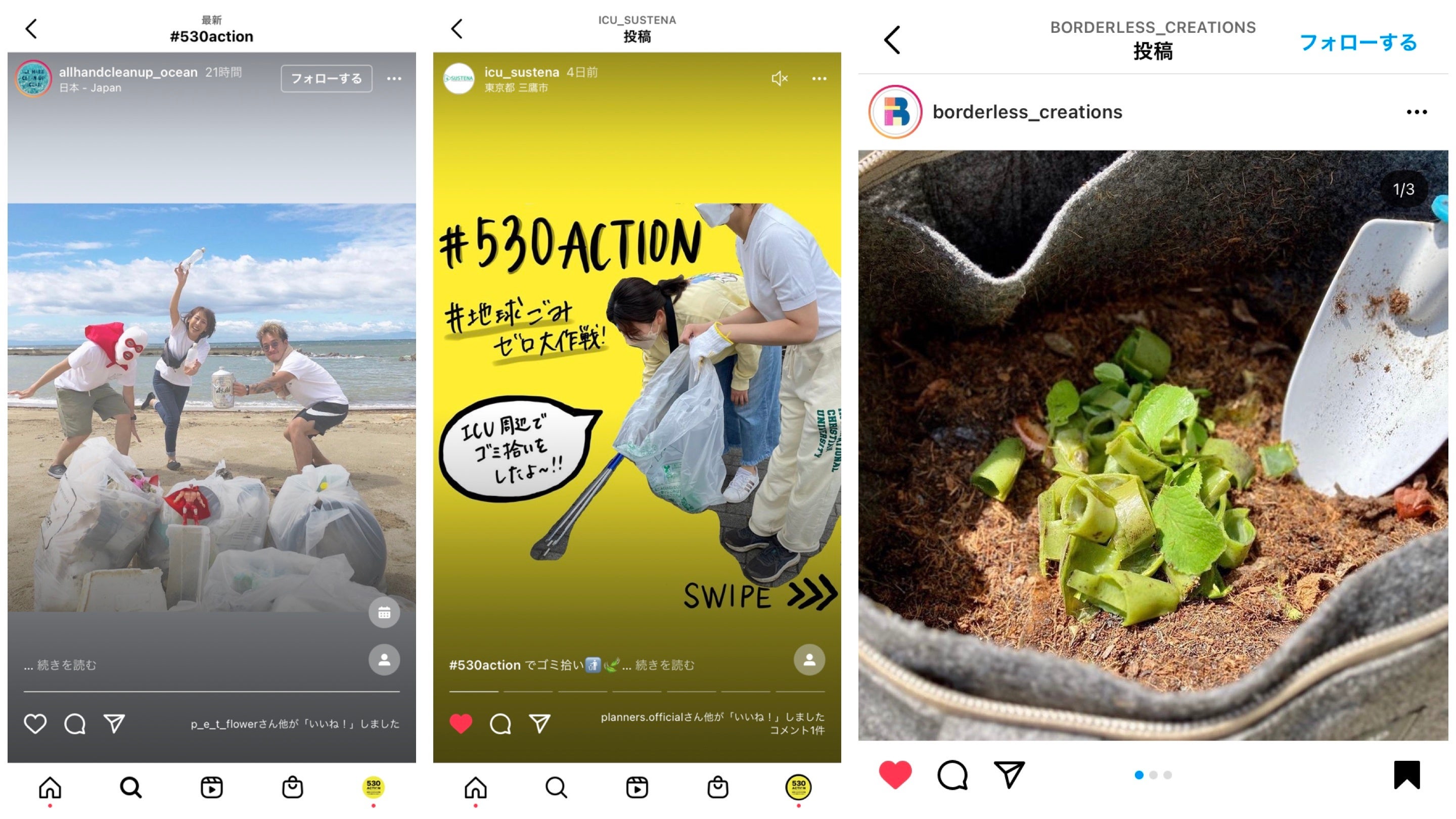 ”#530ACTION”ハッシュタグチャリティー企画は、各種SNS(instagram、Twitter、Facebook、TikTok)で、ごみゼロなアクションをハッシュタグ ”#530ACTION” をつけて投稿すると、1投稿につき530円が、世界最大規模の自然保護団体であるWWFジャパンに寄付される仕組みになっています。