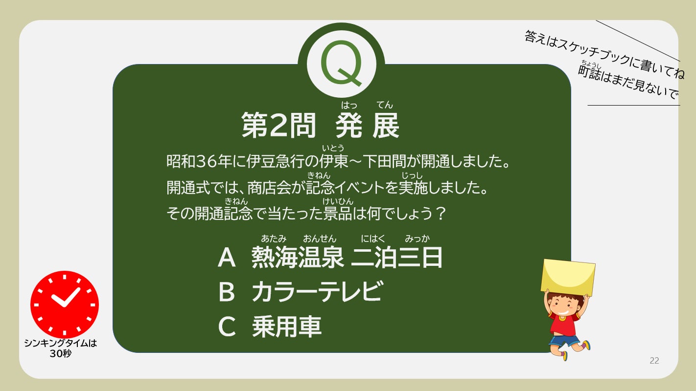 今回のワークショップでは町誌に戻づいた同町稲取地区に関するクイズを作成。