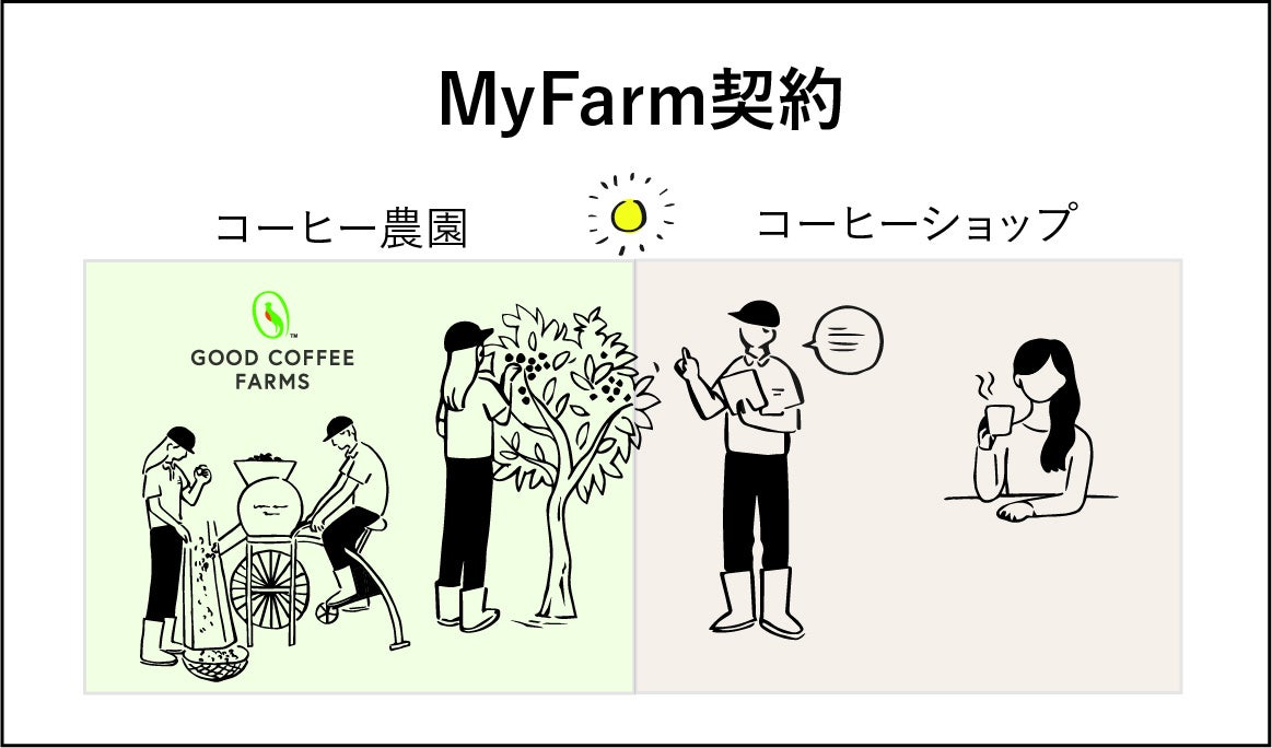 コーヒーショップとGOOD COFFEE FARMSとの間で複数年に亘るコーヒー豆の売買契約を締結し、コーヒーショップはその購入規模に応じて、GOOD COFFEE FARMSに所属する農園(エステート農園)の一区画を「MyFarm」として利用することができます。