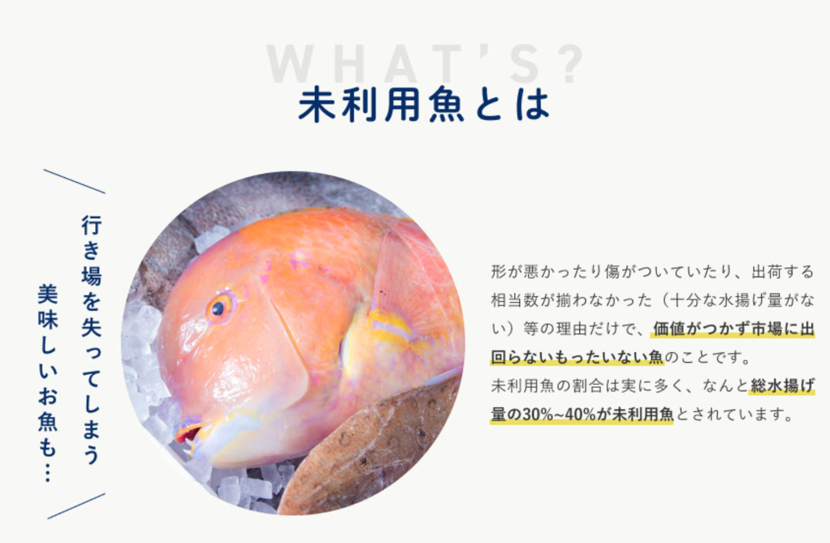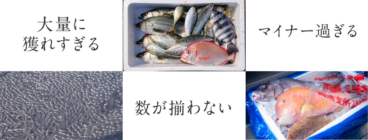 形が悪かったり傷がついていたり、十分な水揚げ量がない等の味には関係のない理由だけで、価値がつかず市場に出回らないもったいない魚のことです。堆肥に加工されるなど、価値が低いとされて安くただ同然の値段で取引される低利用の魚も含みます。