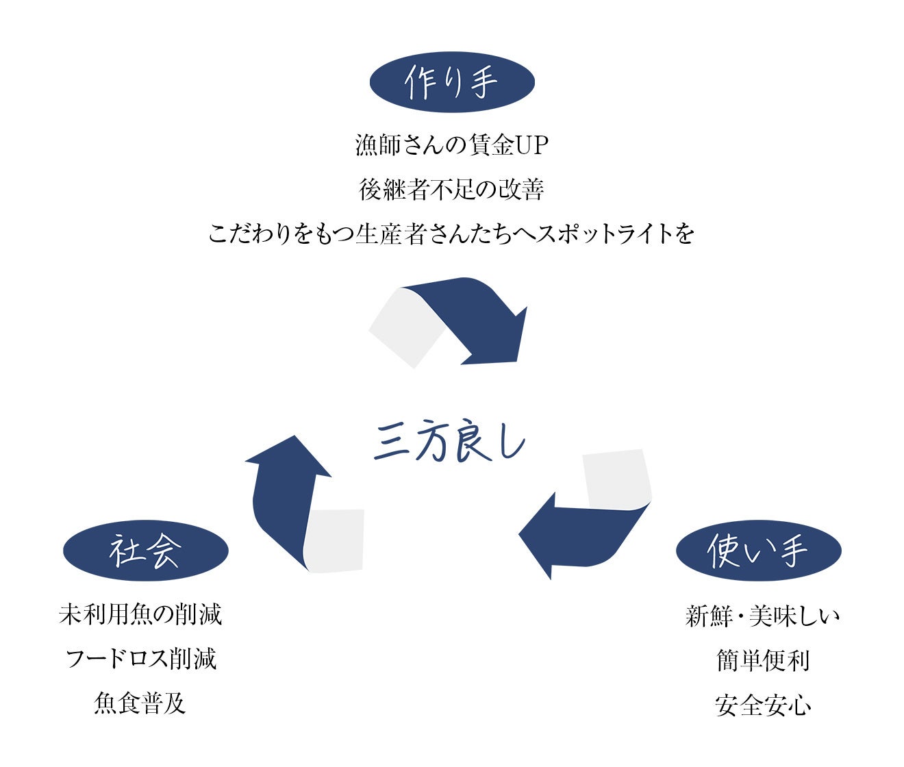 新たな生活様式に対応したお魚ミールパックを普及させることにより衰退の一途をたどる日本の魚食文化の再建を目指しながら、味には関係の無い理由で規格外とされる「未利用魚」を積極的に利用することで、魚のフードロス削減と漁業者の収入の底上げを図り、「SDGs12条:つくる責任 つかう責任」「SDGs14条:海の豊かさを守ろう」への貢献を目指しています。