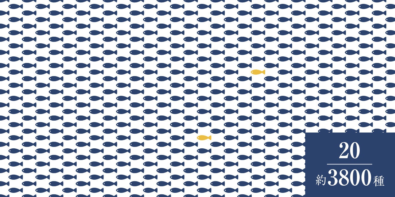日本近海に生息する水産生物は約3,800種類と言われていますが、その中で普段私たちが口にするのは約20種類程度です。