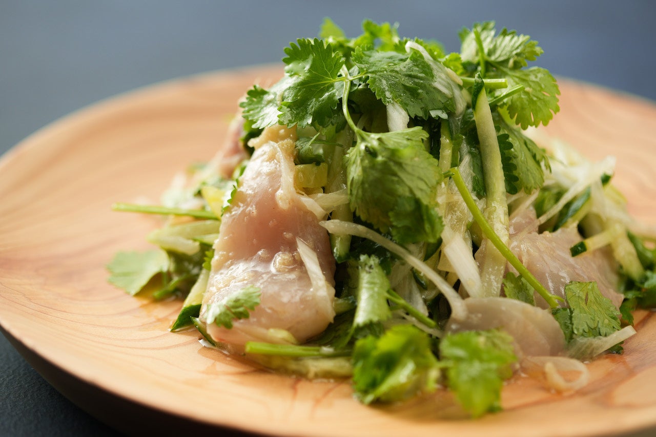 麻辣胡麻風は加熱用です。火入れで崩れやすい魚の身の特徴を、逆にプラスにとらえ、ほろほろの身とねり胡麻のソースが生むクリーミーな舌触りに、麻辣のパンチをバランスよく組み合わせました。黒酢生姜マリネは生食用です。水分も脂分も多めの白身なので、少し塩で締めるとぐんと美味しくなります。おろし生姜と黒酢で仕上げたさっぱりとした味わいを、ぜひ楽しんでみてください。