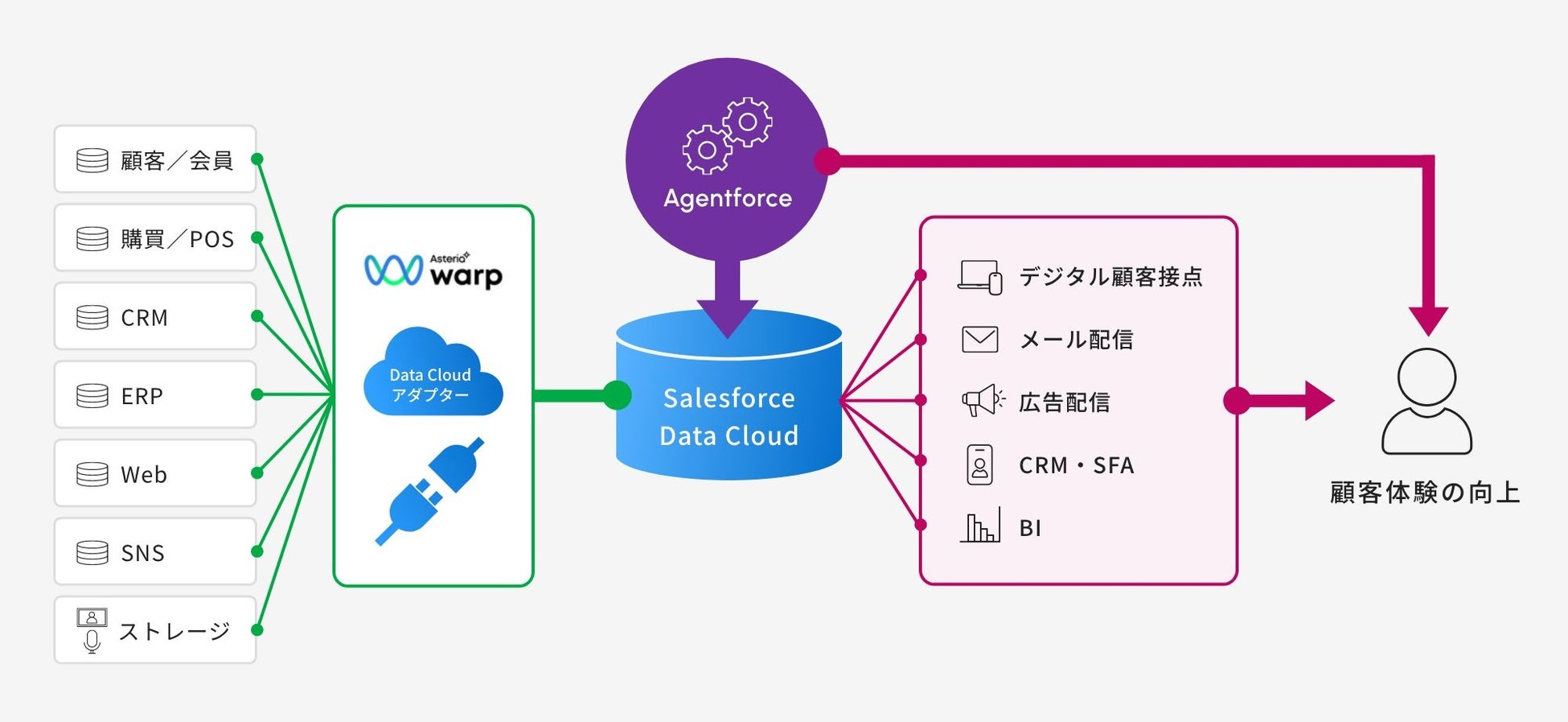 株式会社SI&C(本社︓東京都港区、代表取締役社長︓岩澤 俊典、以下SI&C)とアステリア株式会社(本社︓東 京都渋谷区、代表取締役社長︓平野 洋一郎、証券コード︓3853、以下 アステリア)は、国内ソフトウェア市場で18年間 企業データ連携(EAI/ESB)製品のシェアNo.1※を継続している「ASTERIA Warp(アステリア ワープ、以下Warp)」と、 Salesforceが提供するデータプラットフォーム「Data Cloud」との連携機能を担う「Data Cloudアダプター」を本日より提供開始することを発表します。