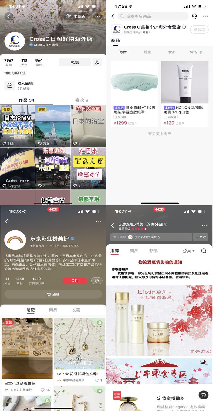 クロスシーでは、2020年より「市場調査」「集客」「マルチチャンネル管理」「越境EC」におけるワンストップの支援ソリューションサービスに取り組んでまいりました。中国ソーシャルECを利用する中国人消費者のシェアは既に50%~80%を占めており、クロスシーは現在最も伸長している抖音(Douyin)にクロスシーの売り場型越境Eコマース旗艦店(複数の商品カテゴリー・多数のブランドを取り扱う総合型店舗)として出店。日本商品の販売を本格的に開始いたしました。現在、家電や化粧品などの売れ筋商品の販売を開始しております。また中国版のInstagramとも言える小红书(RED)においても「東京彩虹桥」と連携し越境Eコマース店舗を運営しており、現在、化粧品・日用品・健康食品など幅広い商品カテゴリを展開しております。