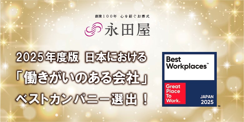 今年で創業112年を迎える、地域密着の葬儀社 株式会社永田屋(神奈川県相模原市、代表取締役田中大輔)は、2025年2⽉12⽇(水)にGreat Place To Workジャパン社(以下、GPTWジャパン)より発表された「働きがいのある会社」ベスト100にランクイン。ベストカンパニーに選ばれたことをお知らせします。