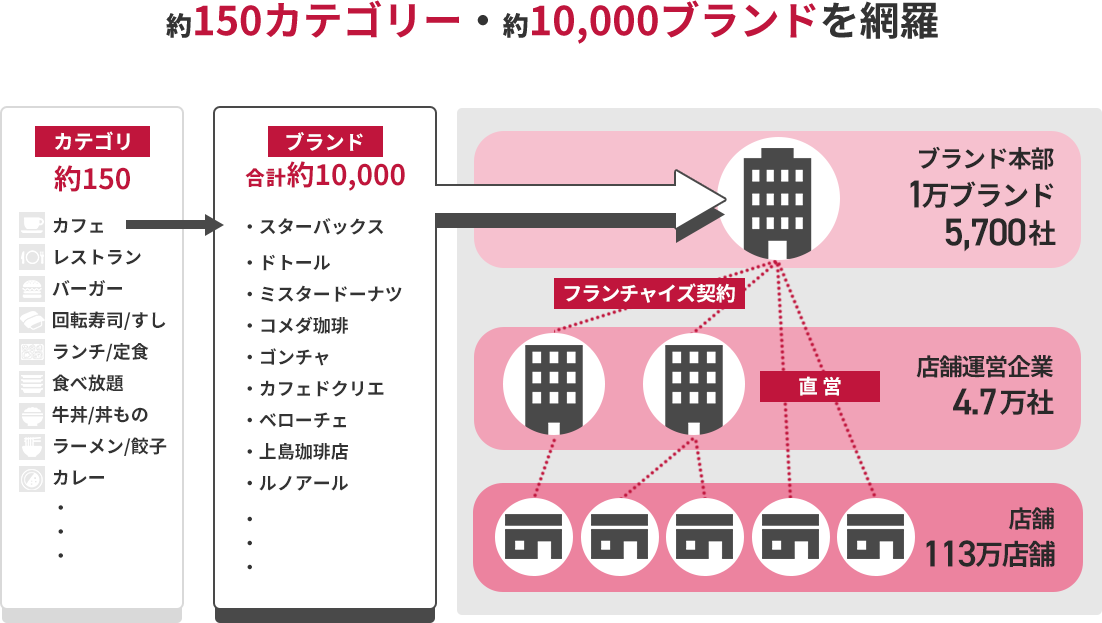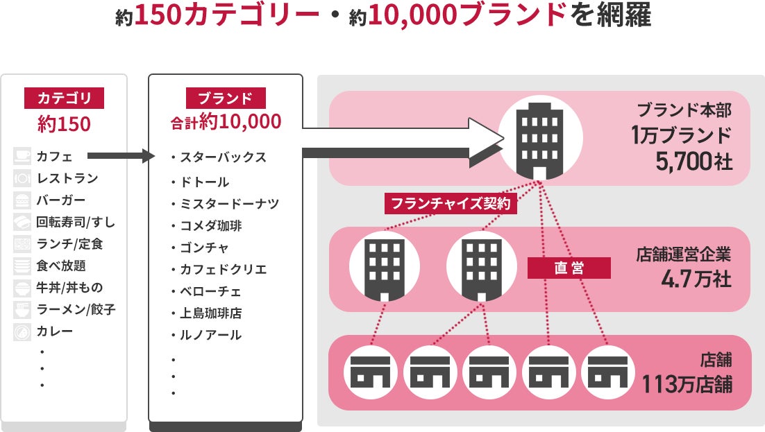 運営企業数が2,000社増加、ブランド元企業5,700社を新たに追加し、また新カテゴリーやチェーンブランドの拡充により、掲載店舗数が82万店舗から113万店舗へと大幅に増加しました。