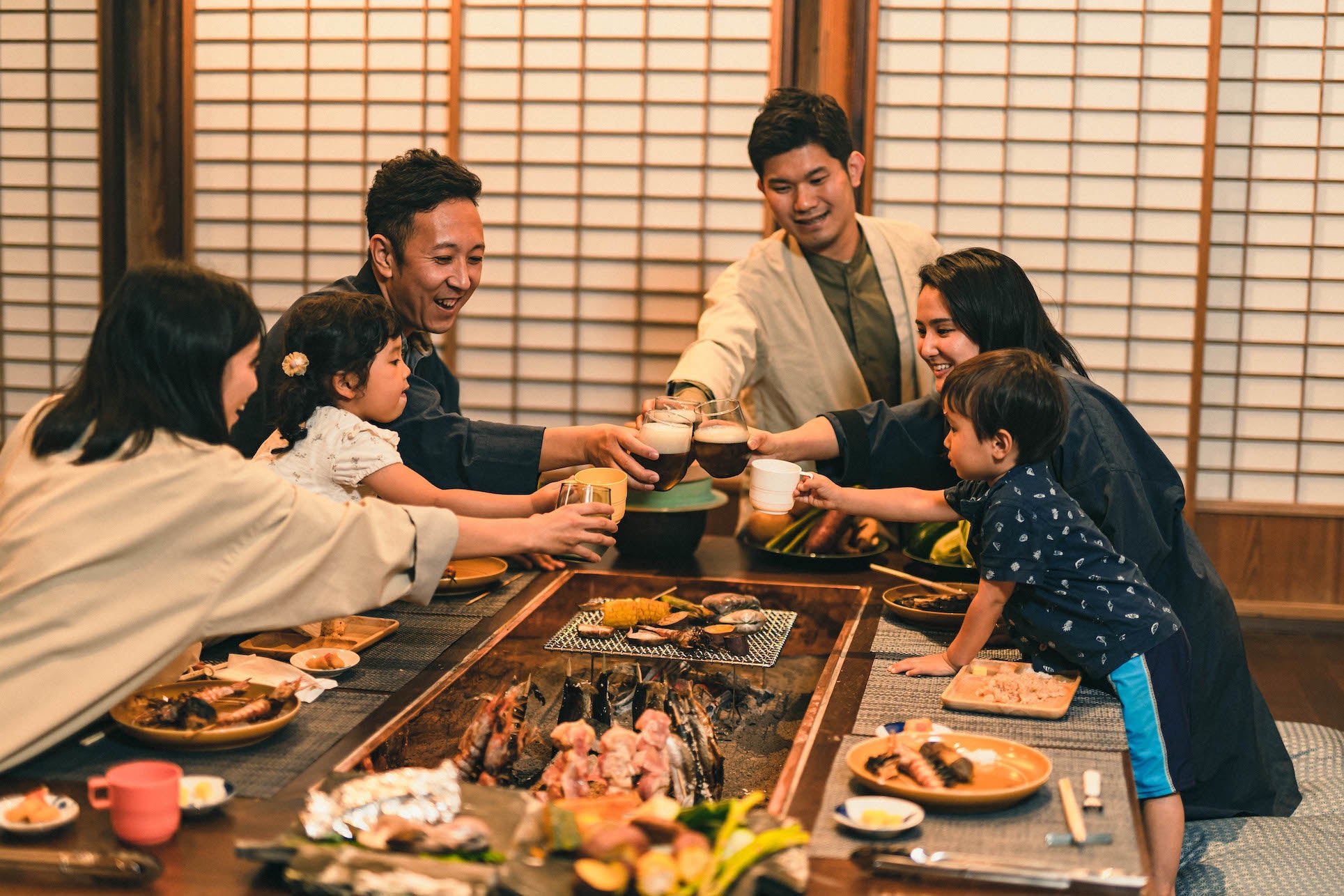 目の前で焼く楽しみ、焼き上げたばかりの熱々を頬張る楽しみ、何より古民家の空間で炭を囲んで食事をするあたたかい時間は、お子様から大人の方まで 非日常の体験となることでしょう。