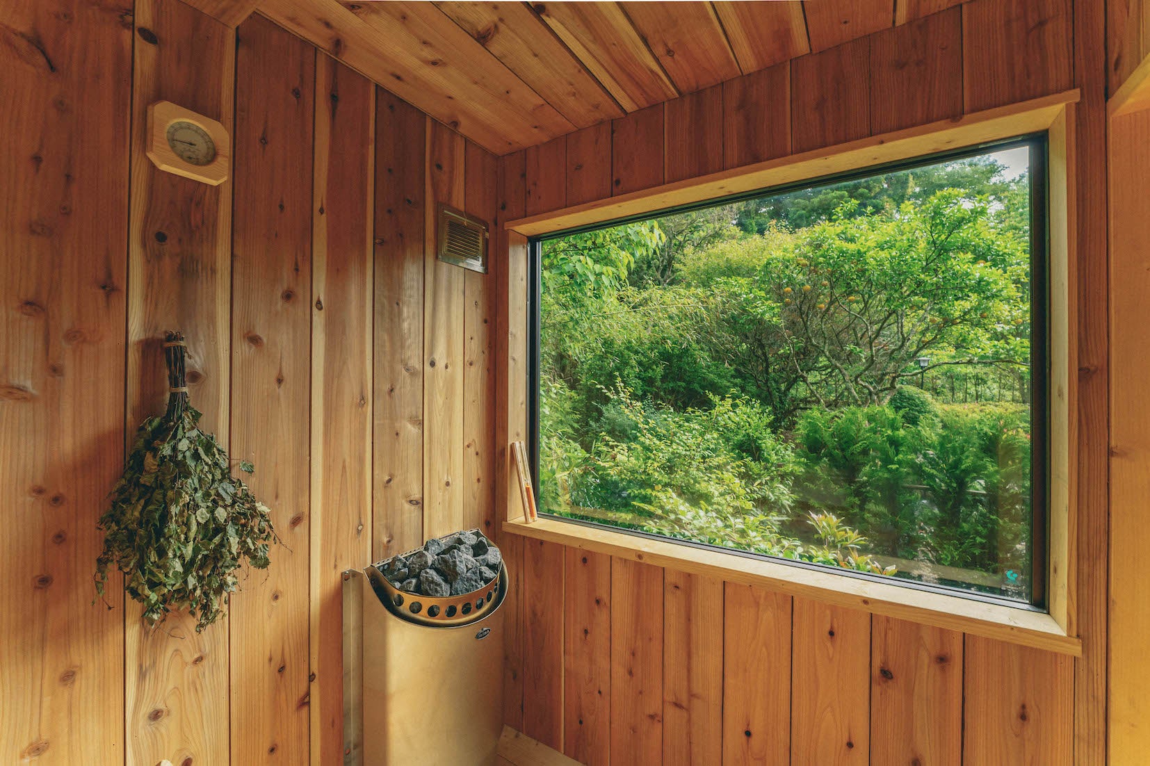 お好きな時間に、杉材が香るサウナ室で森の緑を眺めながらロウリュでじっくり汗を引き出し、山からの井戸水を引いた水風呂でととのえる。