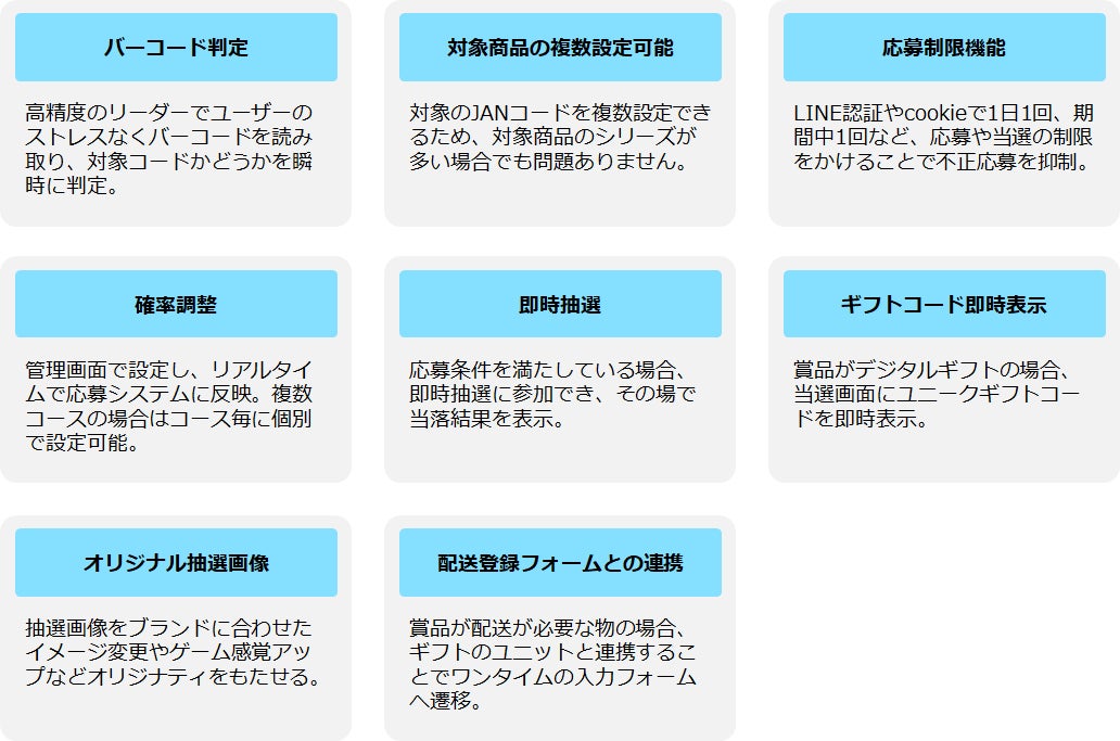 バーコードキャンペーンシステムは、商品パッケージのJANコードを用いて応募することができる、継続購買の促進に最適なキャンペーンのシステムです。インスタントウィンのキャンペーンを実施できるため、デジタルメディアの販促告知やリテンションとの相性がとても高いのがポイントです。