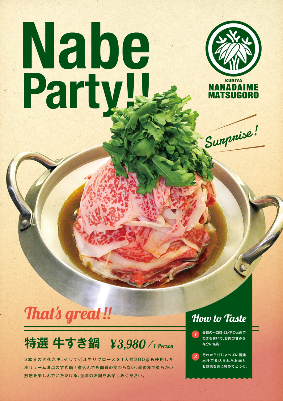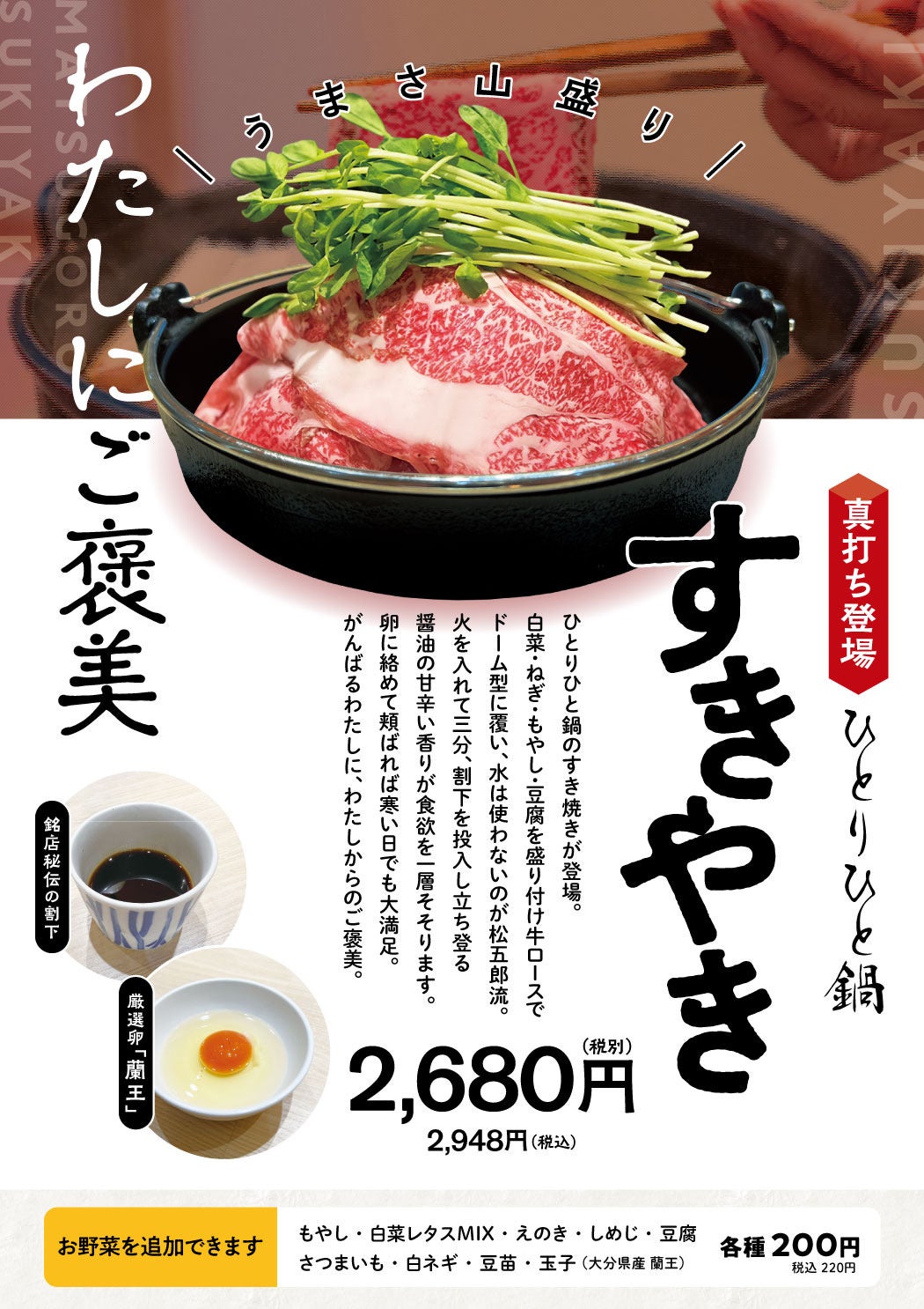 厨七代目松五郎が積み重ねてきたすき焼きへの想い、お客様に向き合う真摯な気持ちをそのままに、気軽に食していただける『すき焼き』へと昇華いたしました。