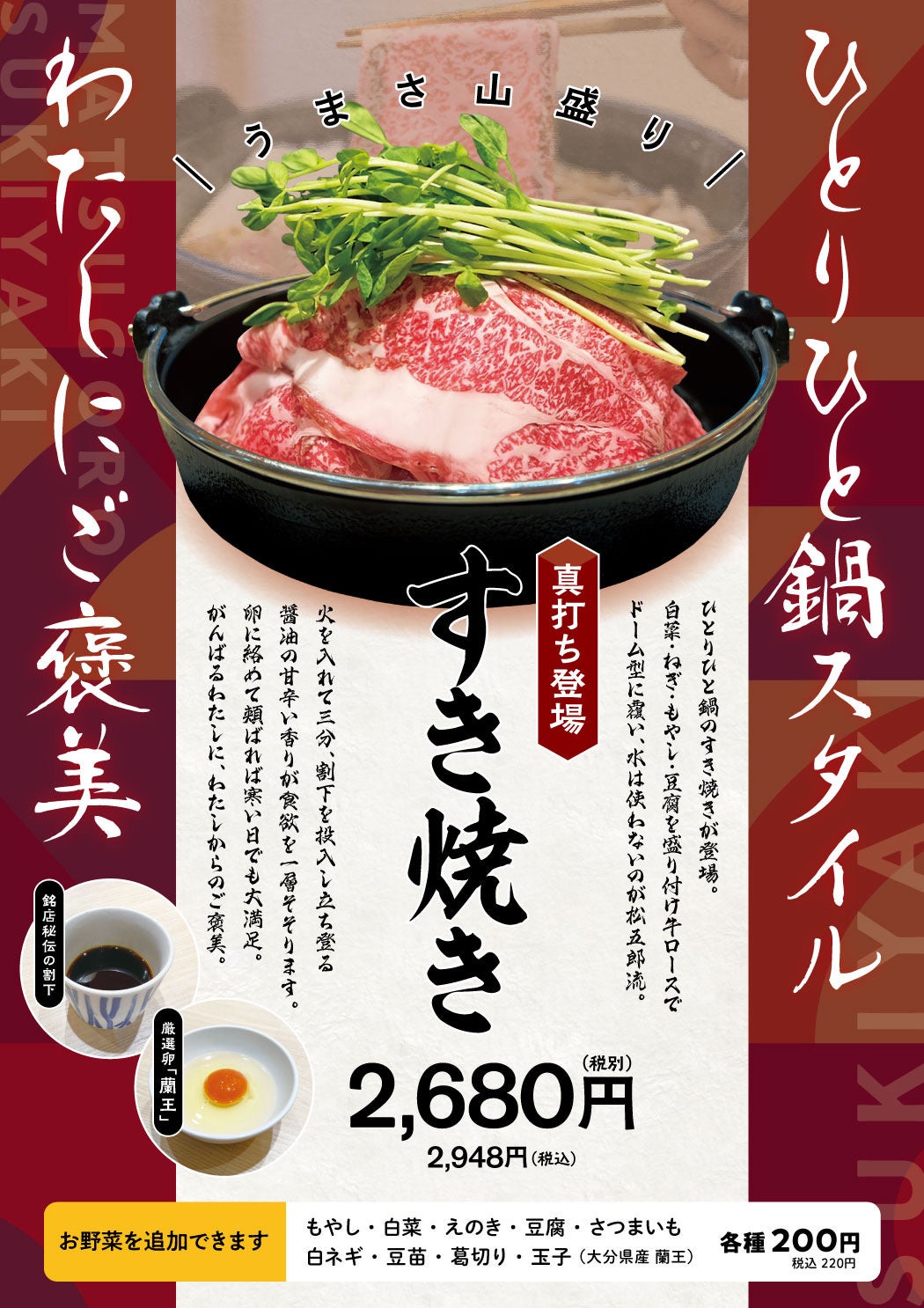 ★株式会社しゃぶしゃぶ松五郎(本社/東京都渋谷区 代表取締役 森 貴代江)が運営する、“ひとりひと鍋”でしゃぶしゃぶを提供する『ひとりしゃぶしゃぶ七代目松五郎』赤坂本店・新宿東宝ビル店に2店舗では、11月21日より【熟成黒毛和牛のすき焼き】の販売を開始致しました。