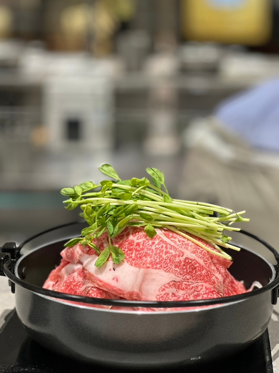 そして水を一切使用しない割下をより美味しくするポイントは、熟成黒毛和牛でドーム状に包まれたたっぷりの野菜からでる旨味たっぷりの水分です。割下の量とお野菜から出る水分を綿密に計算し、最高の状態で召し上がっていただきます。