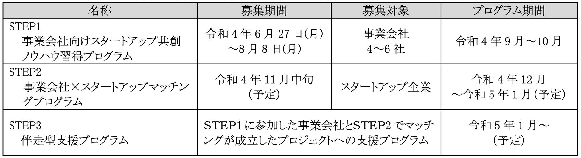 つきましては、スタートアップ企業との共創による新規事業開発や課題解決等を目指す事業会社を募集します。