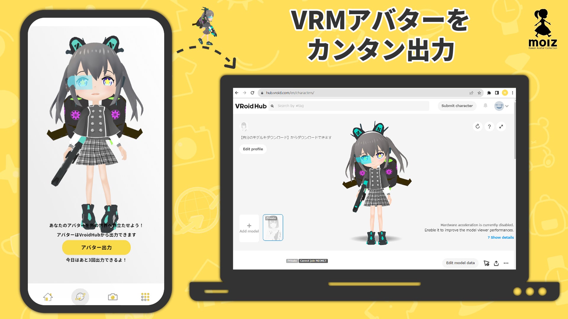 完成したアバターは「VRoid Hub」にアップロードが可能です。また「VRoid Hub」からVRMファイルをダウンロードすることで、対応する様々なサービスでmolzのアバターをお使いいただけます。