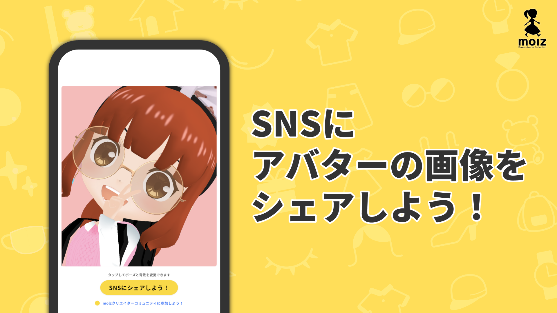 イチオシのコーデが完成したらアバターの画像をSNSでシェアしましょう。SNSシェア画面ではアバターがランダムで可愛いポーズをとってくれます。とっておきのポーズを見つけたらSNSにシェアしましょう!