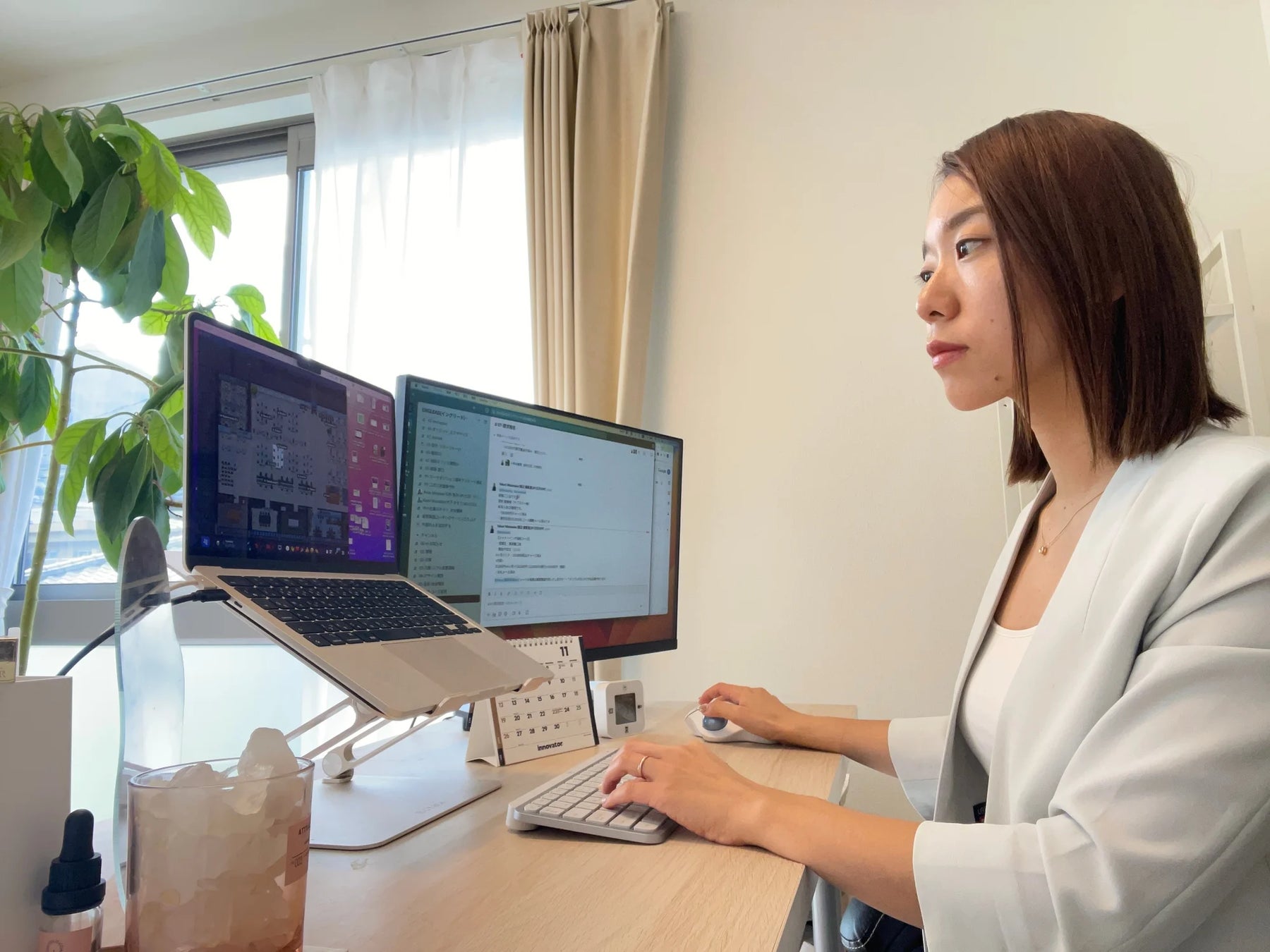 また、リモート勤務のメリットとして、通勤のフィジカル面での疲労などがなくなり、集中しやすい環境が生まれ、結果的に生産性が向上しました。平均的な残業時間は現在1人あたり月間10時間程度で、残業時間もリモート勤務前に比べ半減し、勤務時間あたりのパフォーマンスも高くなっています。