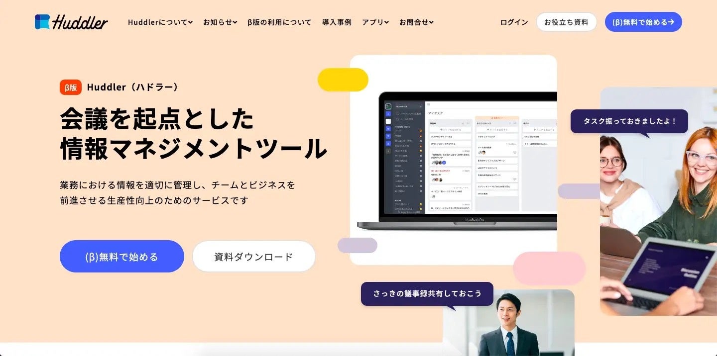 日々の打ち合わせや会議などで様々な情報がアウトプットされる中、膨大な情報を適切に管理することは難しくなっています。情報マネジメントツール『Huddler(ハドラー)』は、「会議」を起点に、タスクやナレッジ、ファイルなどあらゆる情報管理を1プラットフォームで完結させることでチームの業務効率化を促進することができるツールです。現在β版にて提供を開始しており、すでに多くの企業で会議の記録や個人・チームのタスクやプロジェクト管理、社内マニュアル、ファイル管理など、様々なビジネスの現場でお役立ていただいています。