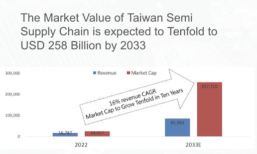 2033年には台湾半導体サプライチェーン企業の収益がTSMCのコストおよび資本支出の49%に達すると予測されており、外国人投資家の保有割合は現在の7%から、大幅に増加することが期待されています。