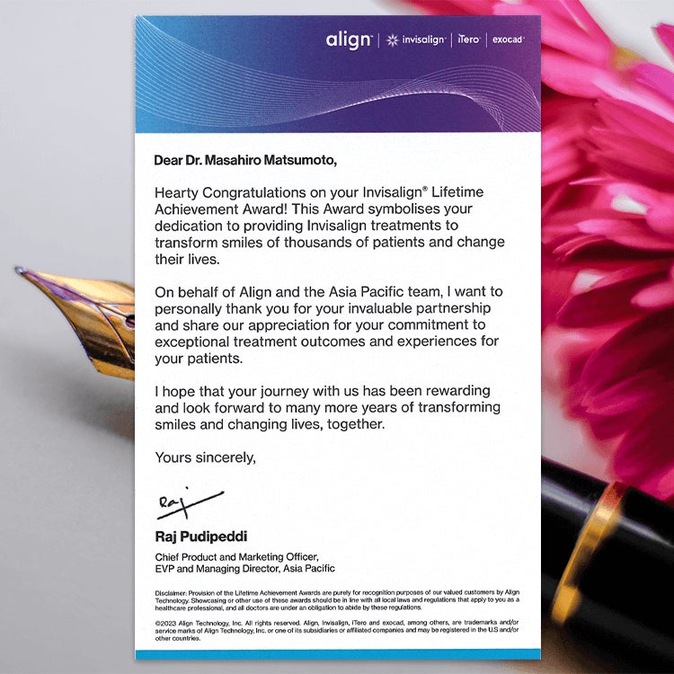 この賞は何千人もの患者の笑顔を変え、彼らの生活に変化をもたらすインビザライン治療を提供することに専念するあなたの象徴です。アラインアジア太平洋チームを代表して、あなたの優れた治療結果と経験のための貴重なパートナーシップと取り組みに感謝の意を表します。私たちと共にこれからも患者さんを笑顔にし、人生を変えていくことを楽しみにしています。
