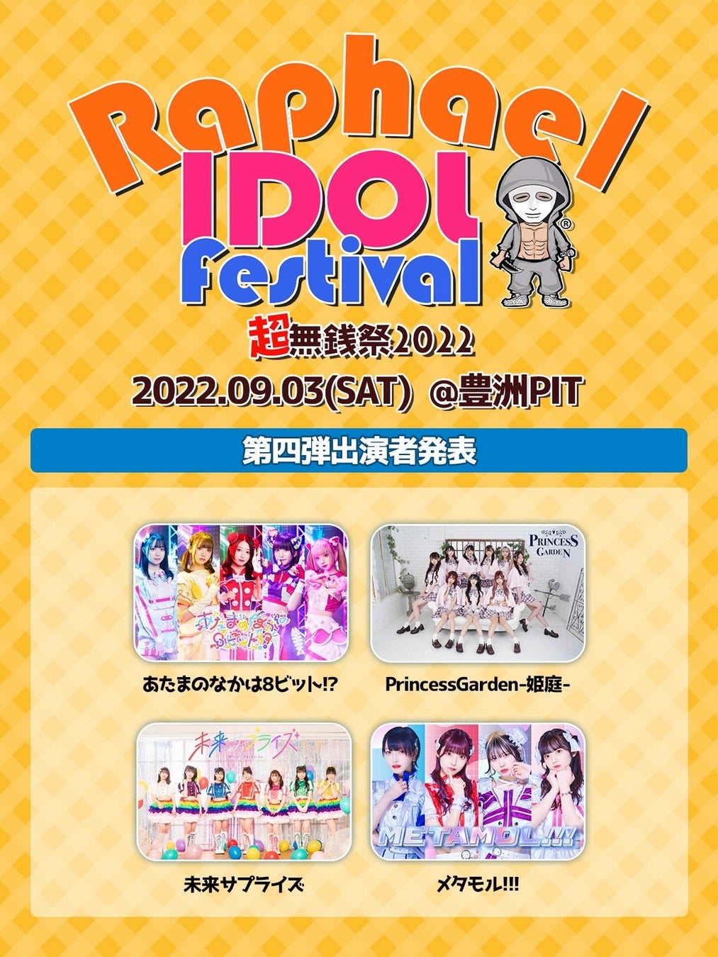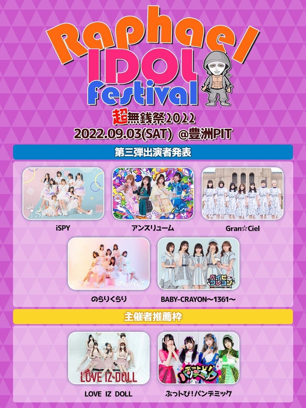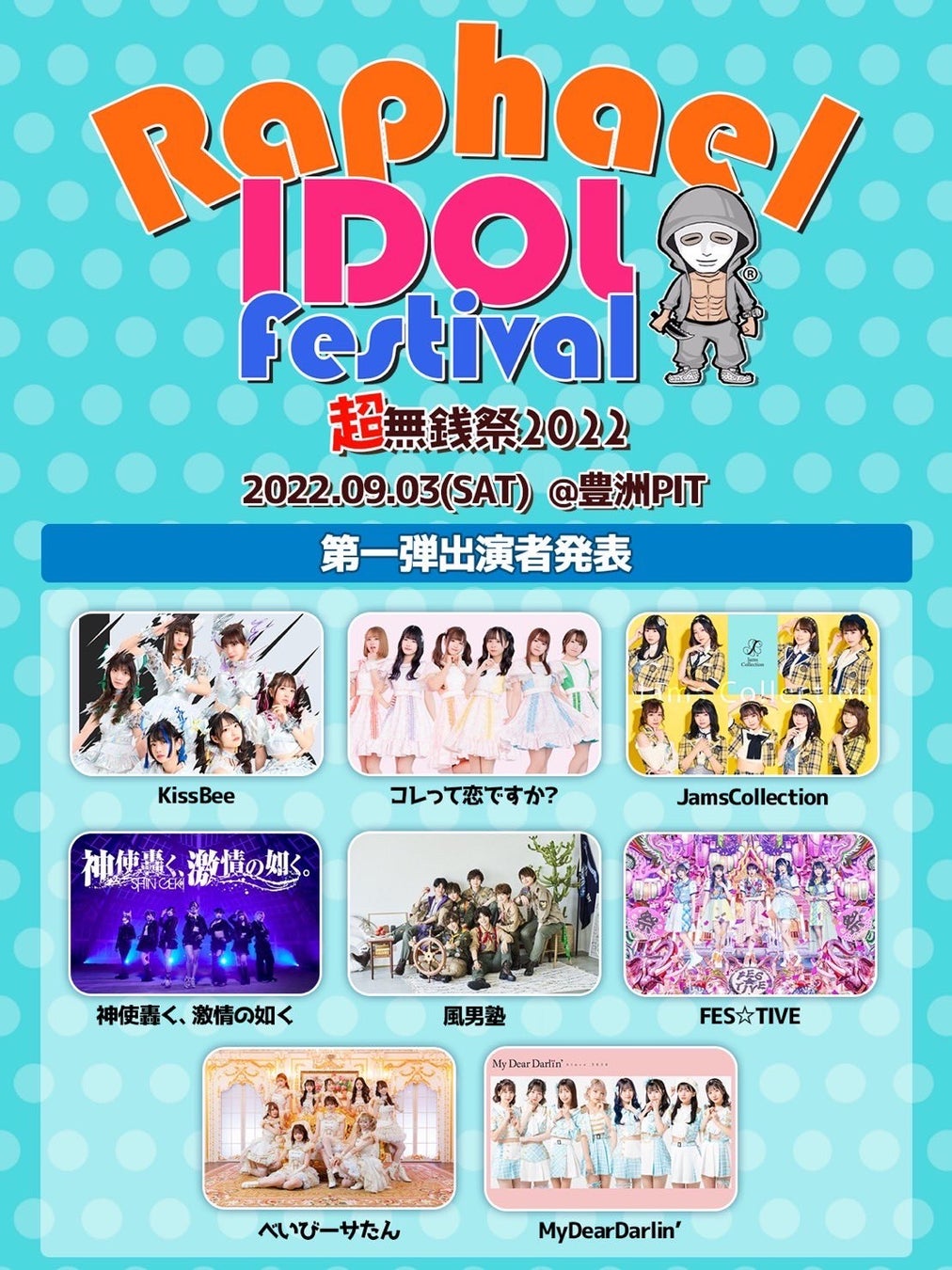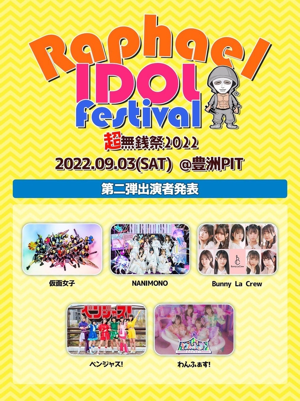 2022年9月3日(土)に、豊洲PIT(東京都江東区)で行われる「Raphael IDOL Festival〜超無銭祭 2022〜」の入場チケットについての概要と、本イベントに出演する参加アイドルグループが追加発表されました。