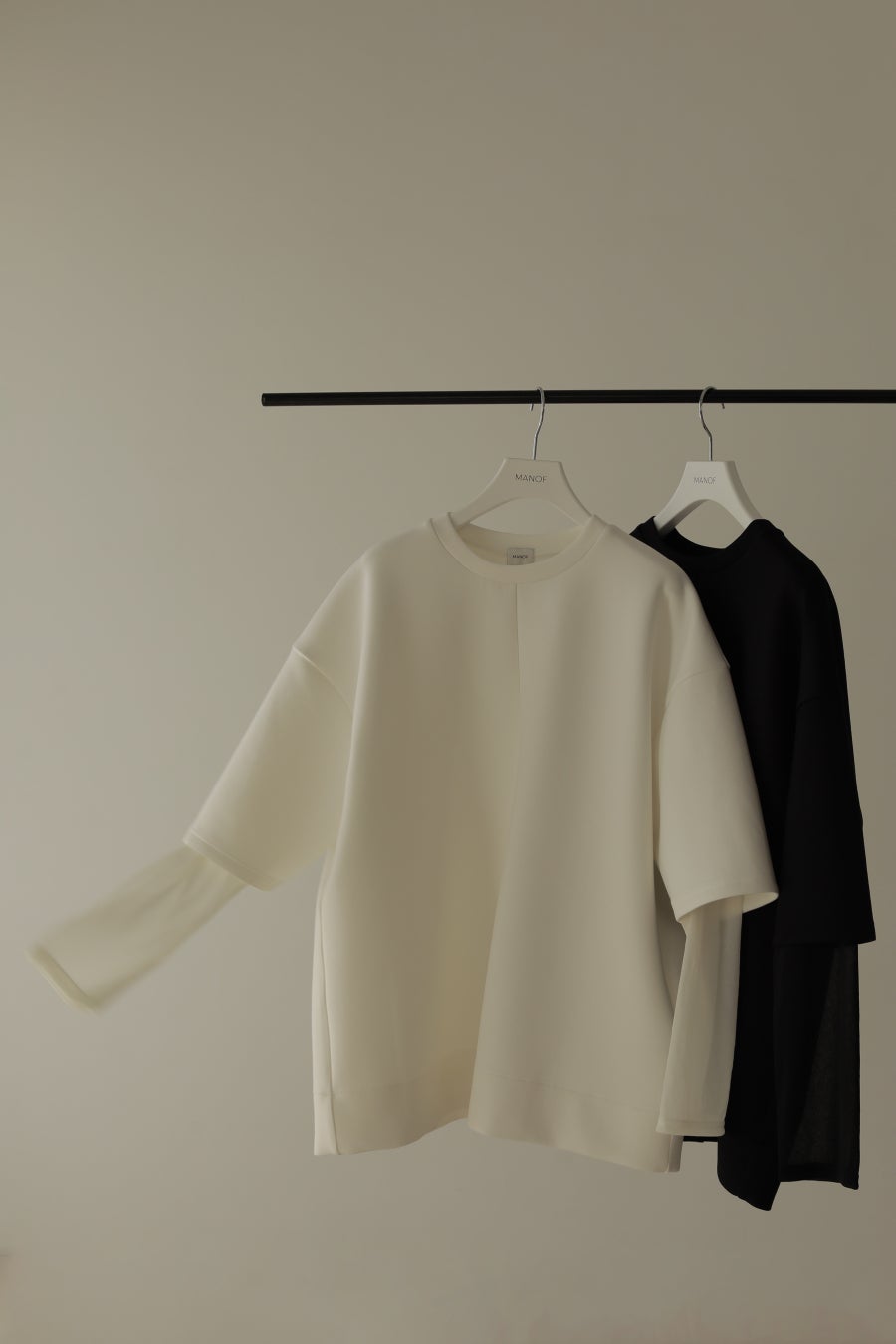 もちもちとした弾力感と、ツルッとした肌触りを兼ね備えたダンボール素材とシアー素材のスリーブをドッキングしたレイヤードトップス。身頃はゆったりとしたサイズ感で、1枚着るだけで簡単にレイヤードスタイルを楽しめます。中の袖もゆったりとしたサイズ感にしているので、全体的にルーズに着用していただけます。MANOFらしいカジュアルなルーズ感は取り入れつつ、袖の素材で女性らしさをプラスしています。