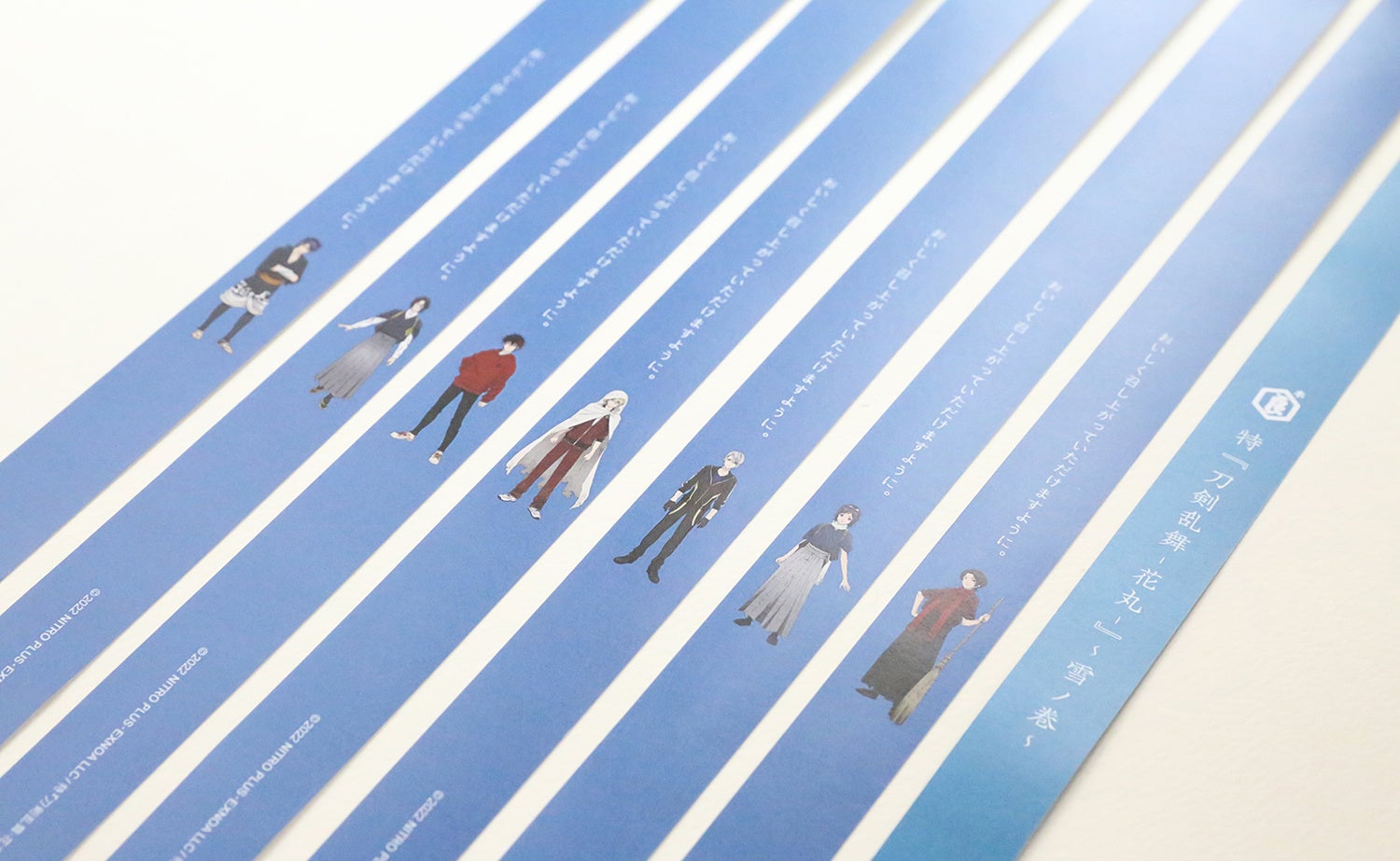 作品に登場する加州清光、大和守安定、陸奥守吉行、肥前忠広、南海太郎朝尊の「刀剣男士紋」と、「雪ノ巻」をイメージした「雪」のマークをうつしました。