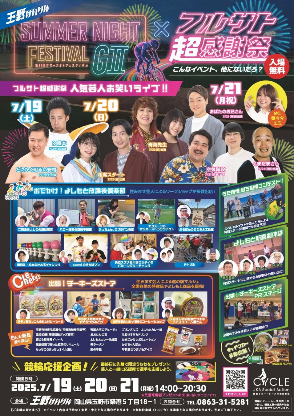 株式会社チャリ・ロト(東京都渋谷区、代表取締役:石原洋輔、以下「当社」)が包括運営を行う玉野競輪場において、第21回サマーナイトフェスティバルを2025年7月18日(金)~7月21日(月・祝)の4日間にわたり開催します。本開催では、最終日の7月21日(月・祝)に、ドローンとLED演出によるナイトパフォーマンスを実施することが決定しましたので、お知らせします。
