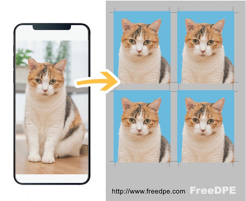 FreeDPE(フリーディーピーイー)はスマホから証明写真をコンビニプリントできるサイトです。ファミリーマート、ローソンのマルチコピー機で24時間プリントできます。AIによる背景変更機能やマルチコピー機の高画質プリントによって、パスポート写真にも使える本格的な証明写真を作ることができます。