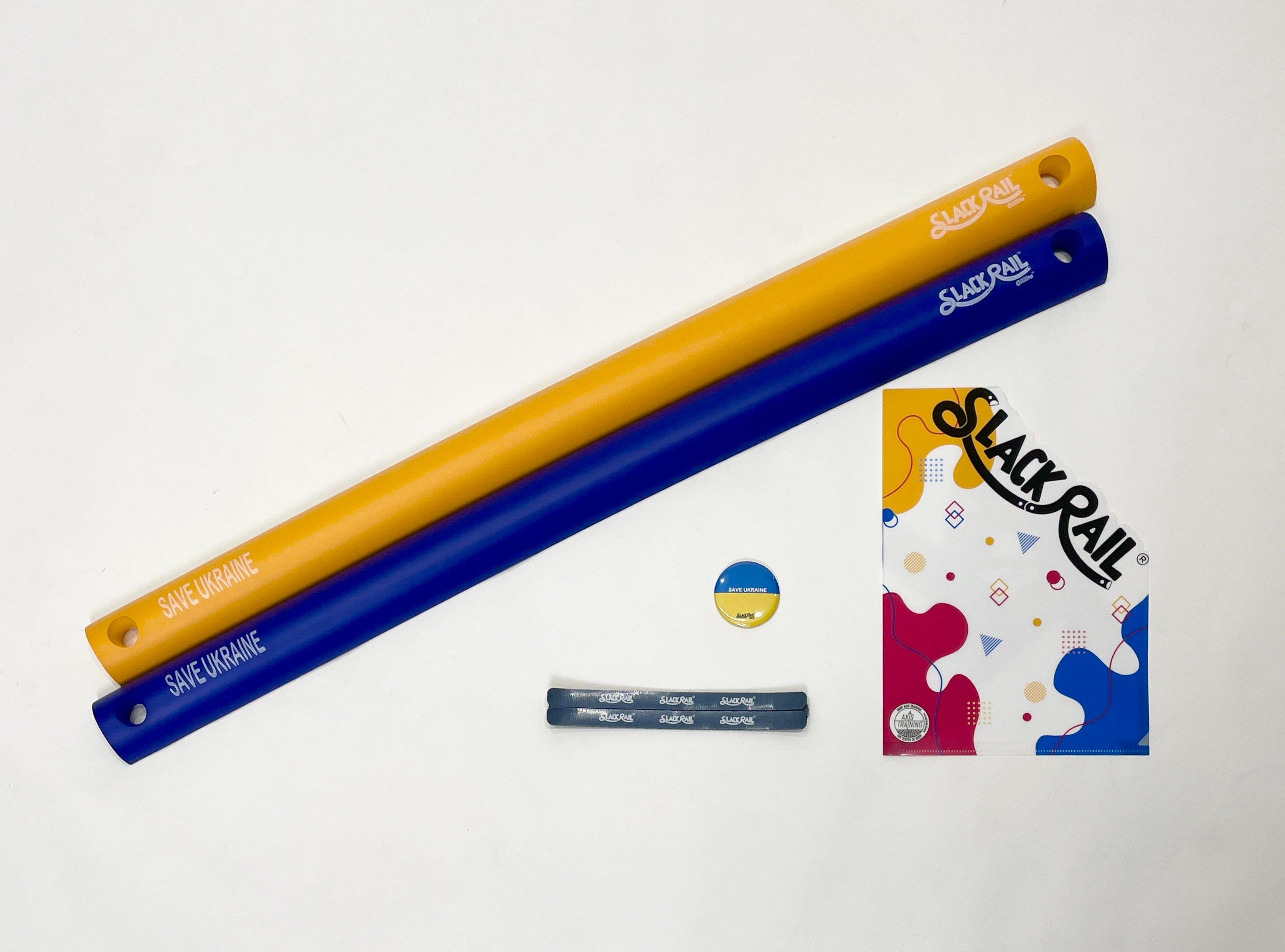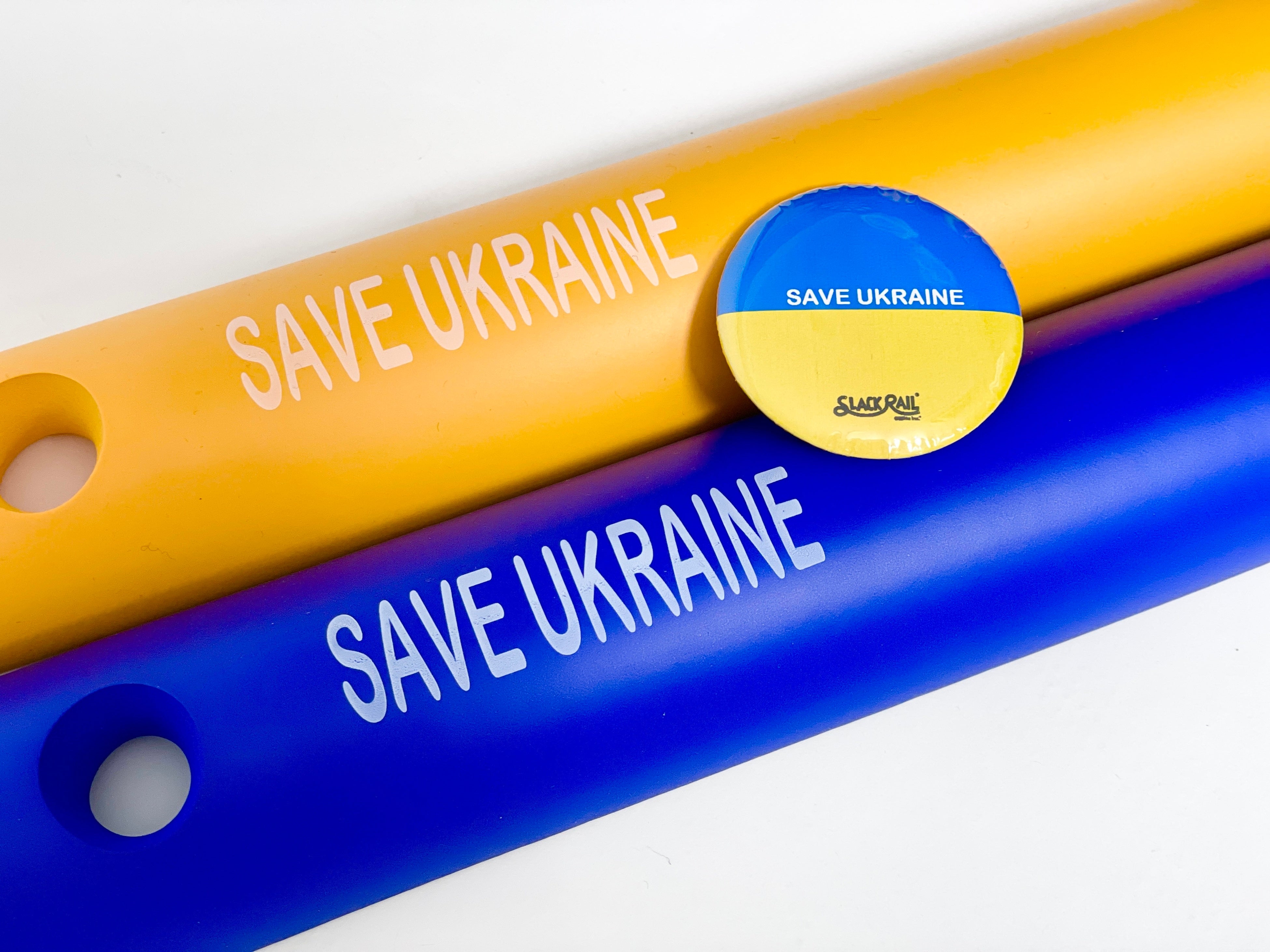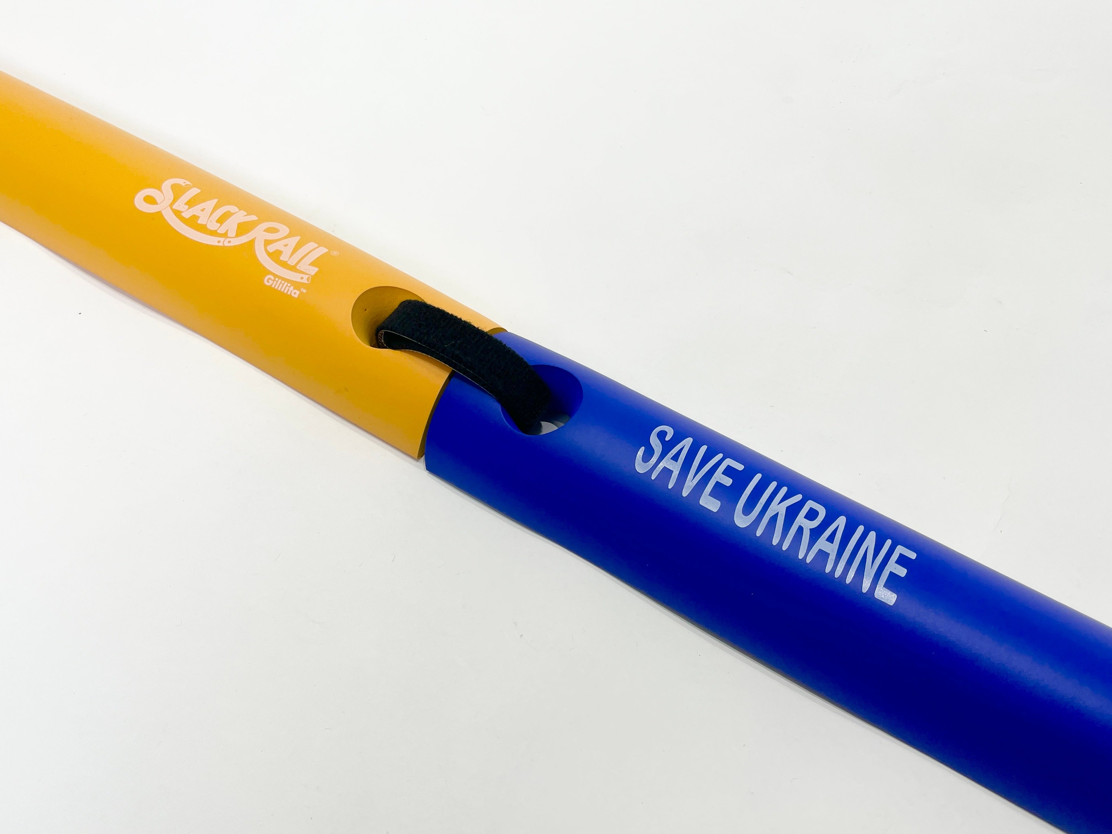 ウクライナの国旗の色であるブルーとイエロー2本のスラックレールに「SAVE UKRAINE」と文字を印刷している限定スラックレールです。