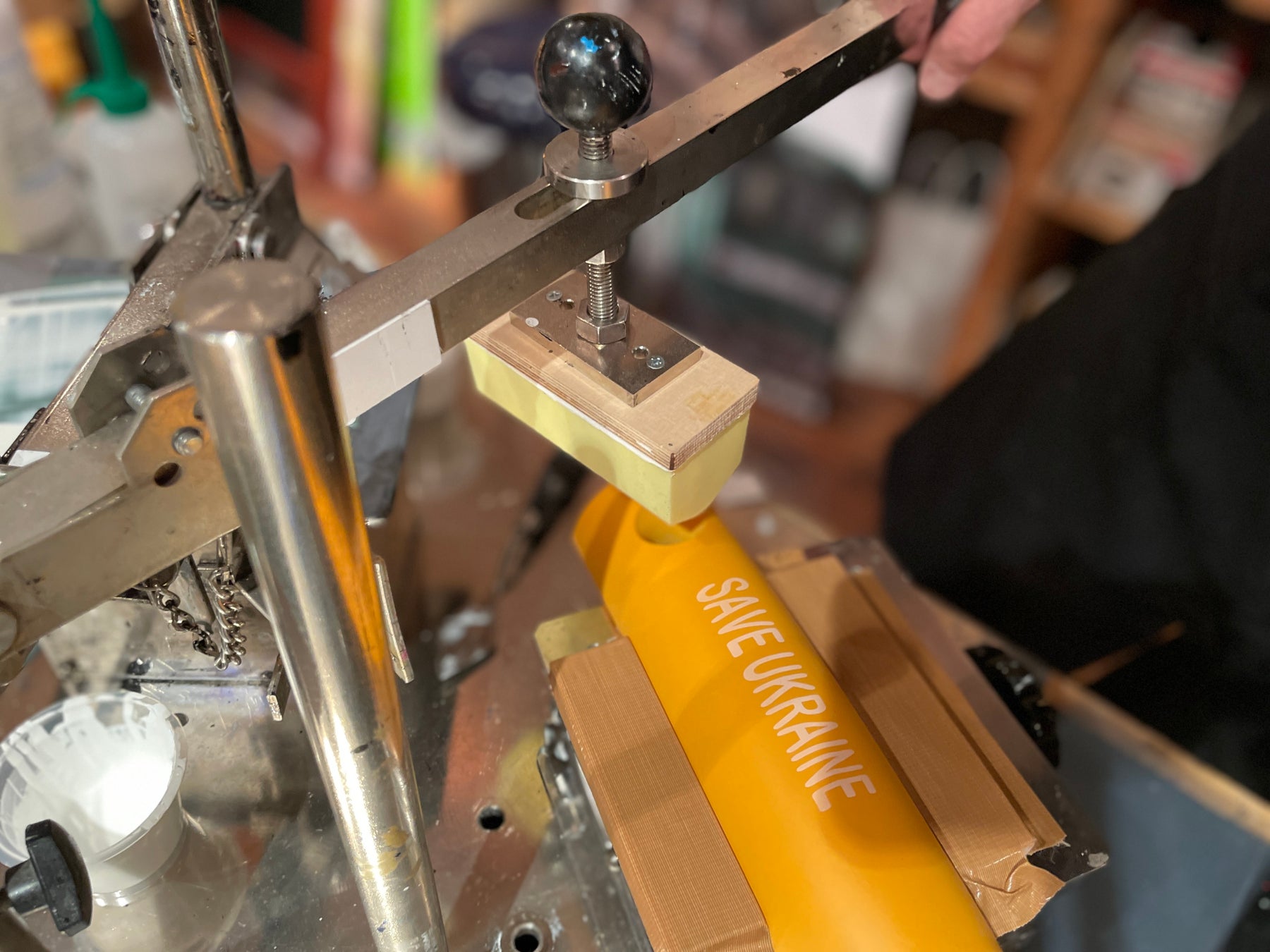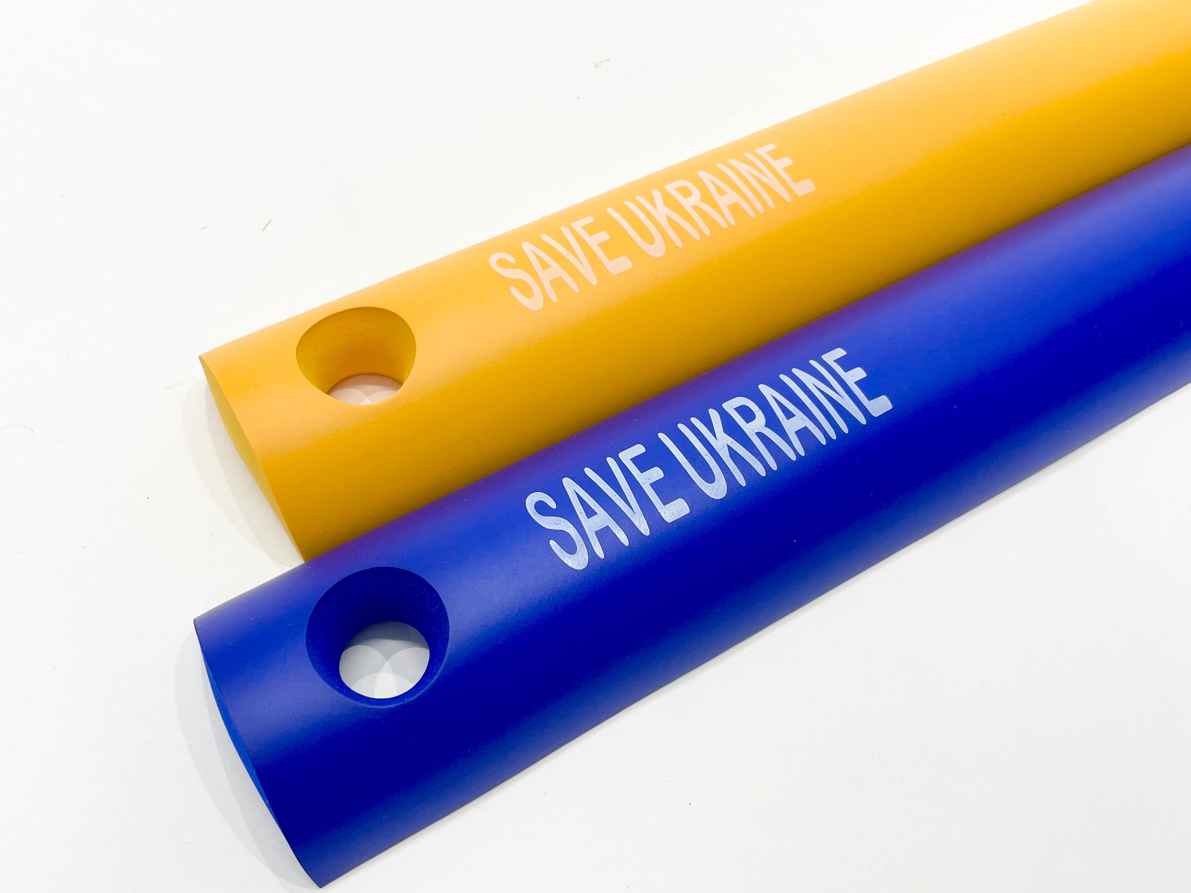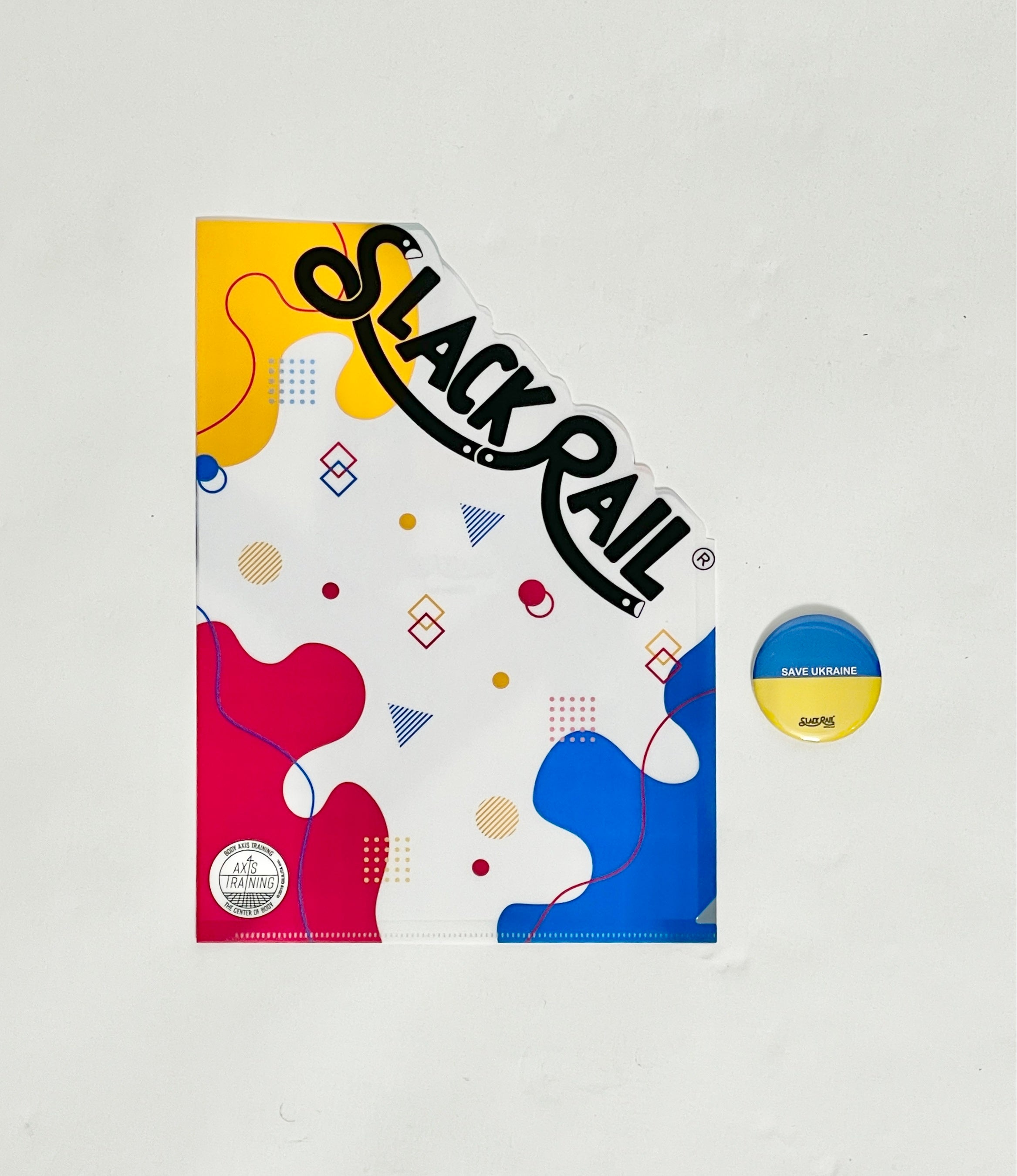 ウクライナの国旗の色であるブルーとイエロー2本のスラックレールに「SAVE UKRAINE」と文字を印刷している限定スラックレールです。