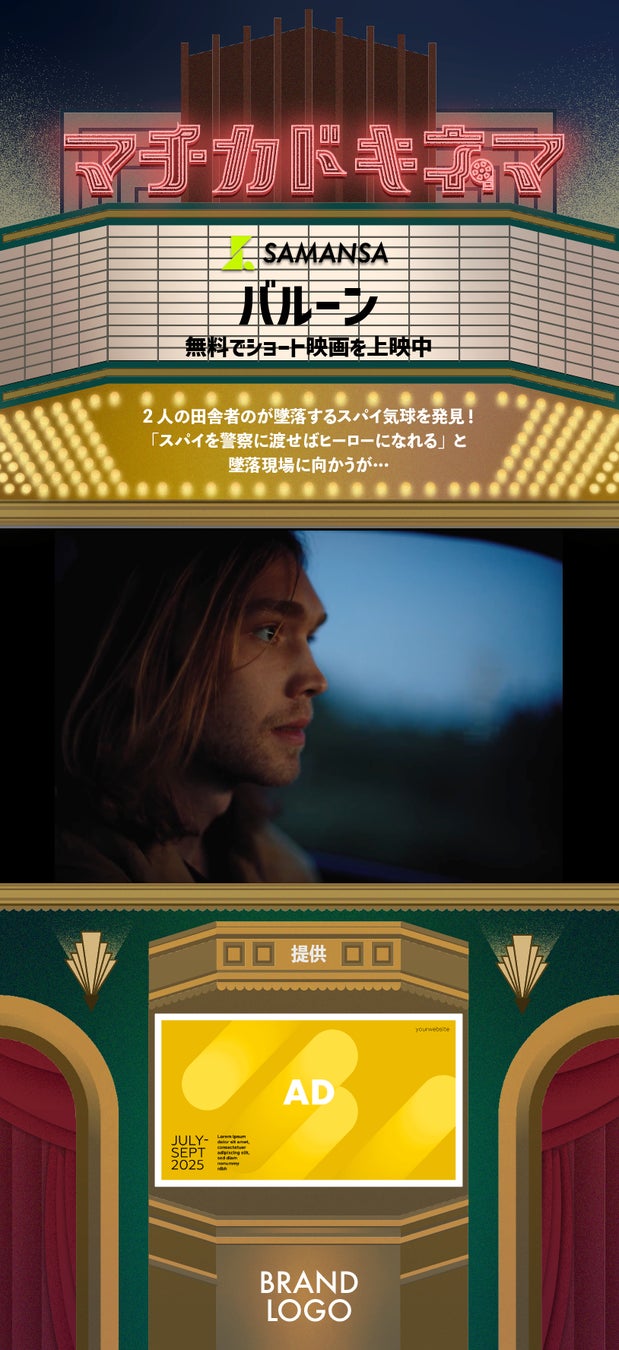「マチカドキネマ」は、SAMANSAが厳選したショート映画を上映し、そのコンテンツと同時または前後に広告を配信する新しい形式のDOOHです。主な特長は下記の4つです。